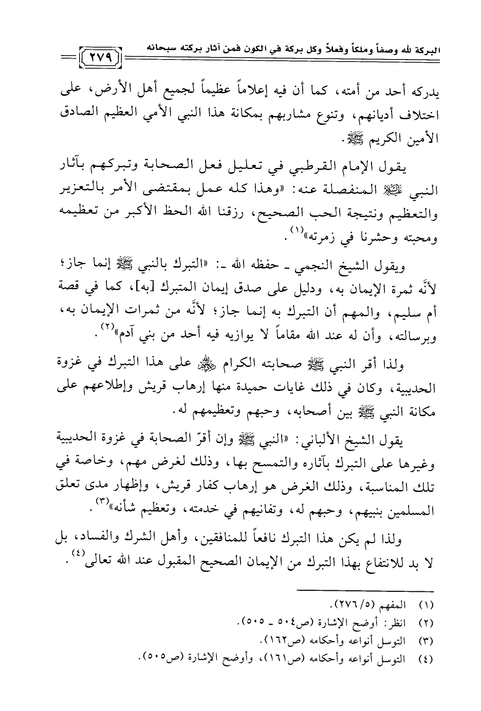 يقول الشيخ الألباني: "النبي -صلى الله عليه وسلم- وإن أقرّ الصحابة في غزوة الحديبية وغيرها على التبرك بآثاره والتمسح بها، وذلك لغرض مهم، وخاصة في تلك المناسبة، وذلك الغرض هو إرهاب كفار قريش، وإظهار مدى تعلق المسلمين بنبيهم، وحبهم له، وتفانيهم في خدمته، وتعظيم شأنه" (¬٣).
