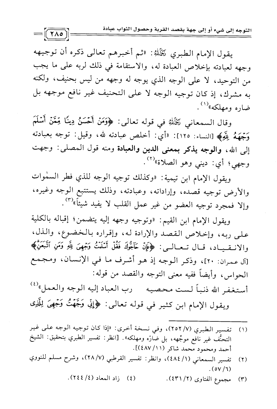 وقال السمعاني رَحِمَهُ الله في قوله تعالى: {وَمَنْ أَحْسَنُ دِينًا مِمَّنْ أَسْلَمَ وَجْهَهُ لِلَّهِ} [النساء: ١٢٥]: "أي: أخلص عبادته لله، وقيل: توجه بعبادته إلى الله، والوجه يذكر بمعنى الدين والعبادة ومنه قول المصلى: وجهت وجهي؛ أي: ديني وهو الصلاة" (¬٢).