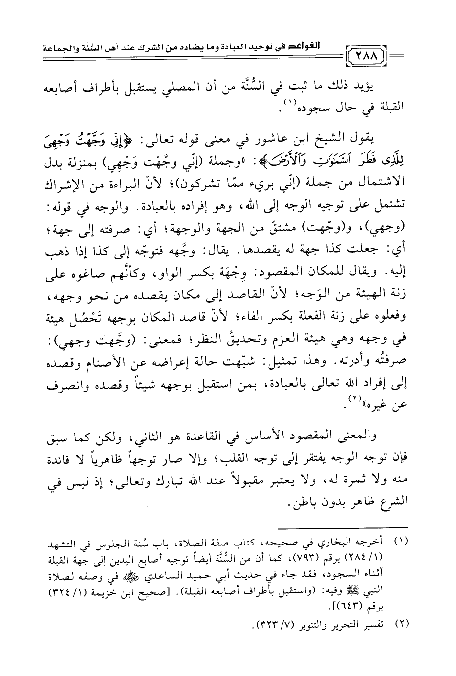والمعنى المقصود الأساس في القاعدة هو الثاني، ولكن كما سبق فإن توجه الوجه يفتقر إلى توجه القلب؛ وإلا صار توجهًا ظاهريًا لا فائدة منه ولا ثمرة له، ولا يعتبر مقبولًا عند الله تبارك وتعالى؛ إذ ليس في الشرع ظاهر بدون باطن.