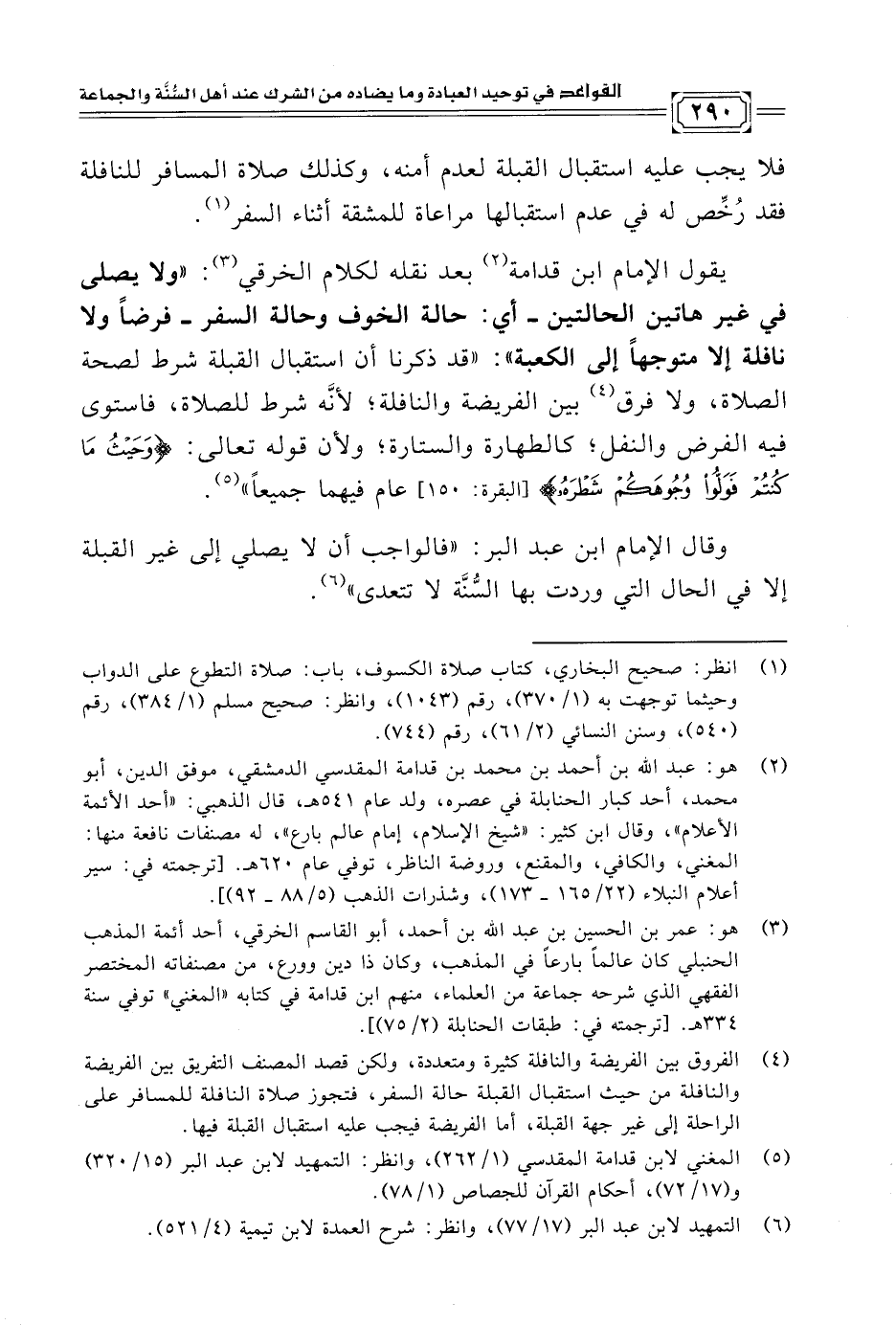 يقول الإمام ابن قدامة (¬٢) بعد نقله لكلام الخرقي (¬٣): "ولا يصلى في غير هاتين الحالتين -أي: حالة الخوف وحالة السفر- فرضًا ولا نافلة إلا متوجهًا إلى الكعبة": "قد ذكرنا أن استقبال القبلة شرط لصحة الصلاة، ولا فرق (¬٤) بين الفريضة والنافلة؛ لأنَّه شرط للصلاة، فاستوى فيه الفرض والنفل؛ كالطهارة والستارة؛ ولأن قوله تعالى: {وَحَيْثُ مَا كُنْتُمْ فَوَلُّوا وُجُوهَكُمْ شَطْرَهُ} [البقرة: ١٥٠] عام فيهما جميعًا" (¬٥).