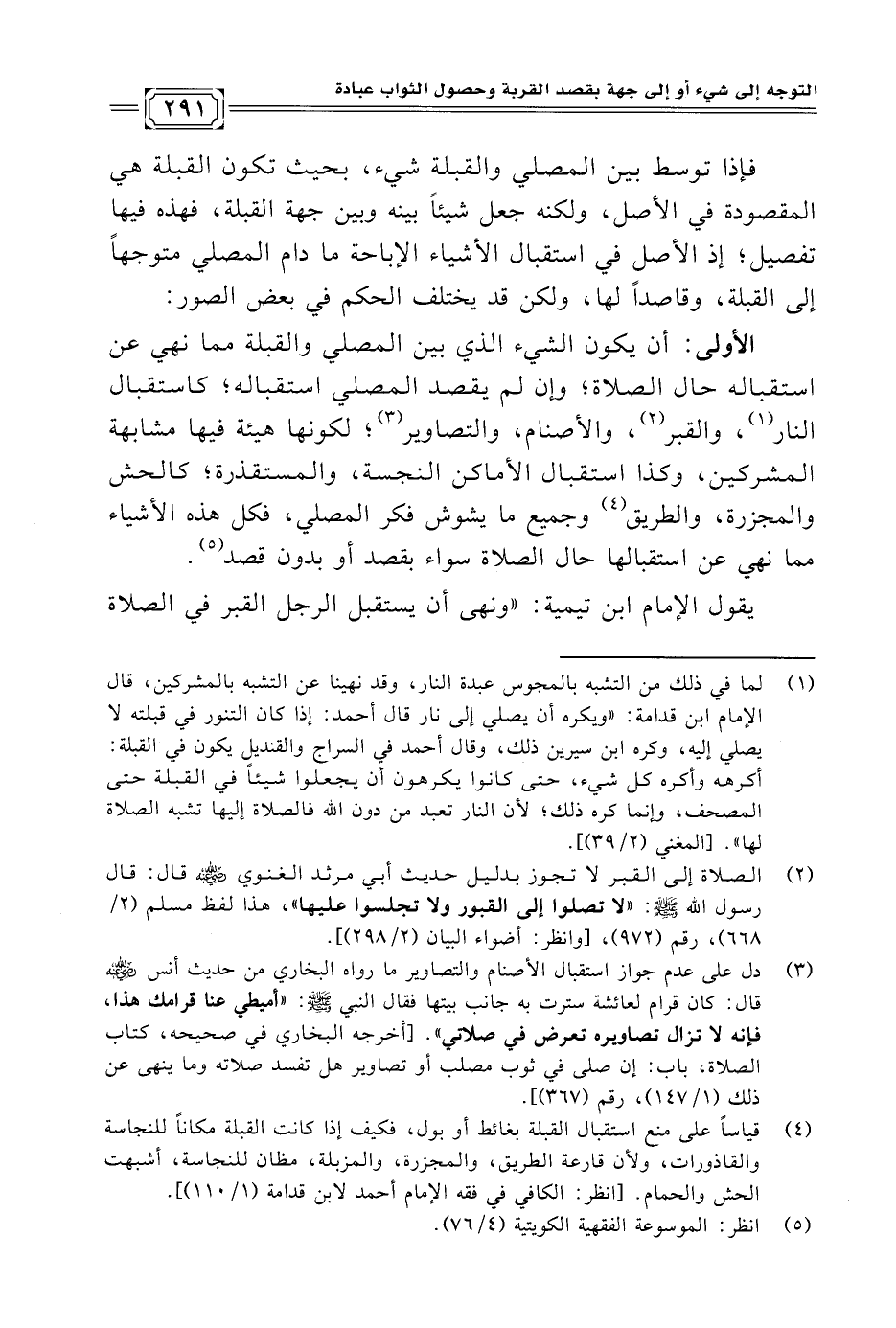 الأولى: أن يكون الشيء الذي بين المصلي والقبلة مما نهي عن استقباله حال الصلاة؛ وإن لم يقصد المصلي استقباله؛ كاستقبال النار (¬١)، والقبر (¬٢)، والأصنام، والتصاوير (¬٣)؛ لكونها هيئة فيها مشابهة المشركين، وكذا استقبال الأماكن النجسة، والمستقذرة؛ كالحش والمجزرة، والطريق (¬٤) وجميع ما يشوش فكر المصلي، فكل هذه الأشياء مما نهي عن استقبالها حال الصلاة سواء بقصد أو بدون قصد (¬٥).