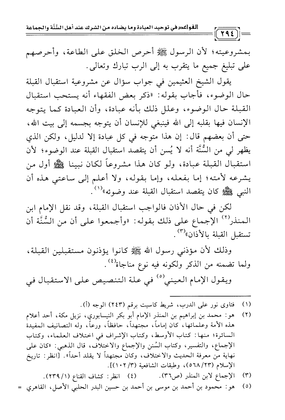 يقول الشيخ العثيمين في جواب سؤال عن مشروعية استقبال القبلة حال الوضوء، فأجاب بقوله: "ذكر بعض الفقهاء أنه يستحب استقبال القبلة حال الوضوء، وعلل ذلك بأنه عبادة، وأن العبادة كما يتوجه الإنسان فيها بقلبه إلى الله فينبغي للإنسان أن يتوجه بجسمه إلى بيت الله، حتى أن بعضهم قال: إن هذا متوجه في كل عبادة إلا لدليل، ولكن الذي يظهر لي من السُّنَّة أنه لا يُسن أن يتقصد استقبال القبلة عند الوضوء؛ لأن استقبال القبلة عبادة، ولو كان هذا مشروعًا لكان نبينا -صلى الله عليه وسلم- أول من يشرعه لأمته؛ إما بفعله، وإما بقوله، ولا أعلم إلى ساعتي هذه أن النبي -صلى الله عليه وسلم- كان يتقصد استقبال القبلة عند وضوئه" (¬١).