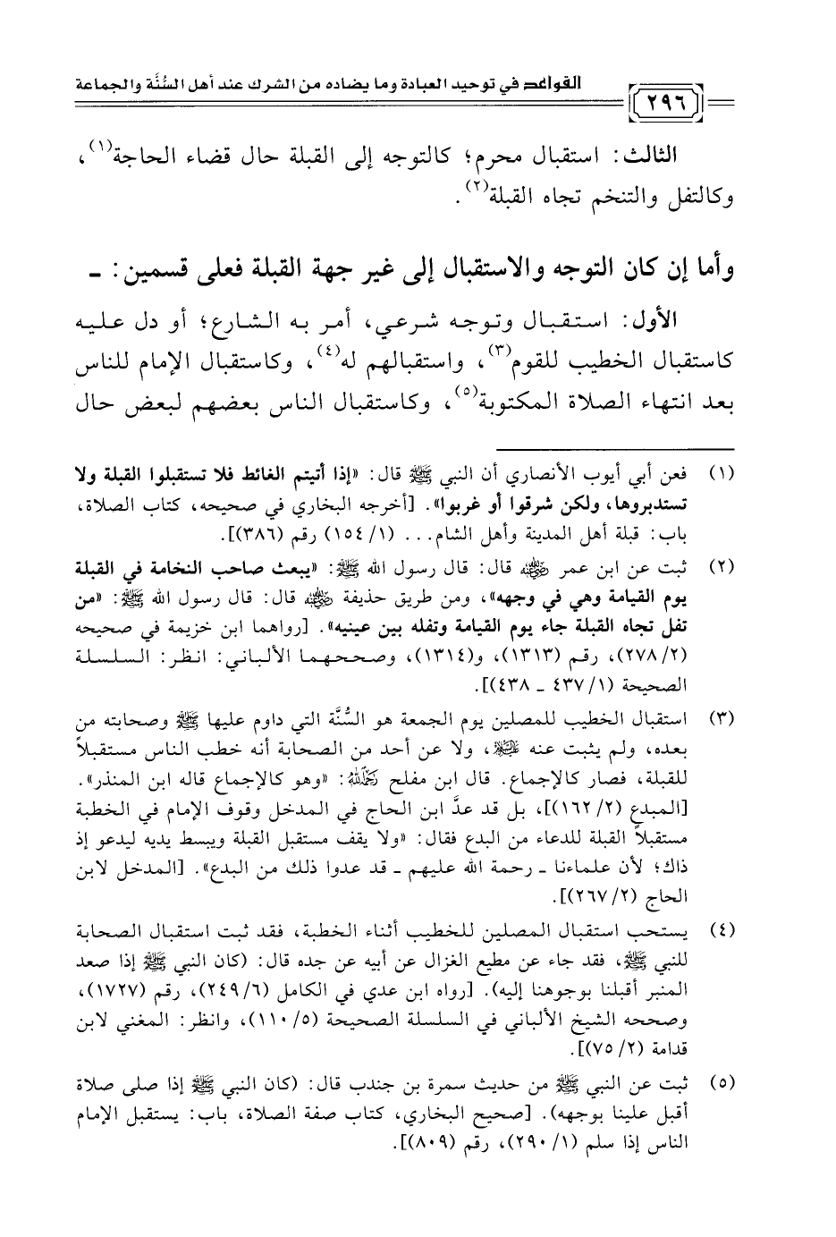 الأول: استقبال وتوجه شرعي، أمر به الشارع، أو دل عليه كاستقبال الخطيب للقوم (¬٣)، واستقبالهم له (¬٤)، وكاستقبال الإمام للناس بعد انتهاء الصلاة المكتوبة (¬٥)، وكاستقبال الناس بعضهم لبعض حال