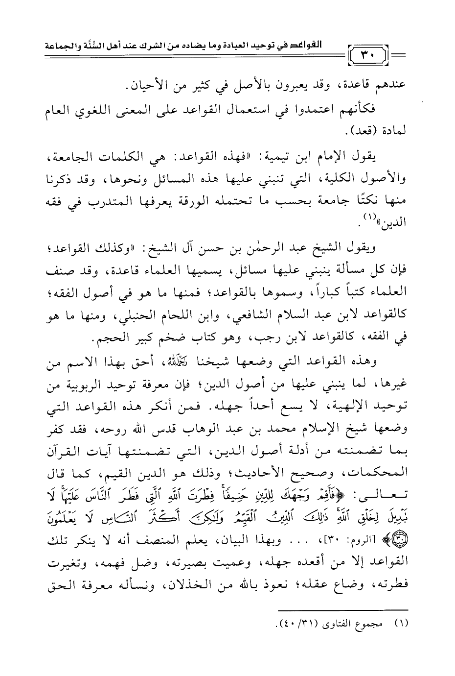 وهذه القواعد التي وضعها شيخنا الله، أحق بهذا الاسم من غيرها، لما ينبني عليها من أصول الدين؛ فإن معرفة توحيد الربوبية من توحيد الإلهية، لا يسع أحدًا جهله. فمن أنكر هذه القواعد التي وضعها شيخ الإسلام محمد بن عبد الوهاب قدس الله روحه، فقد كفر بما تضمنته من أدلة أصول الدين، التي تضمنتها آيات القرآن المحكمات، وصحيح الأحاديث؛ وذلك هو الدين القيم، كما قال تعالى: {فَأَقِمْ وَجْهَكَ لِلدِّينِ حَنِيفًا فِطْرَتَ اللَّهِ الَّتِي فَطَرَ النَّاسَ عَلَيْهَا لَا تَبْدِيلَ لِخَلْقِ اللَّهِ ذَلِكَ الدِّينُ الْقَيِّمُ وَلَكِنَّ أَكْثَرَ النَّاسِ لَا يَعْلَمُونَ (٣٠)} [الروم: ٣٠]، ... وبهذا البيان، يعلم المنصف أنه لا ينكر تلك القواعد إلا من أقعده جهله، وعميت بصيرته، وضل فهمه، وتغيرت فطرته، وضاع عقله؛ نعوذ بالله من الخذلان، ونسأله معرفة الحق