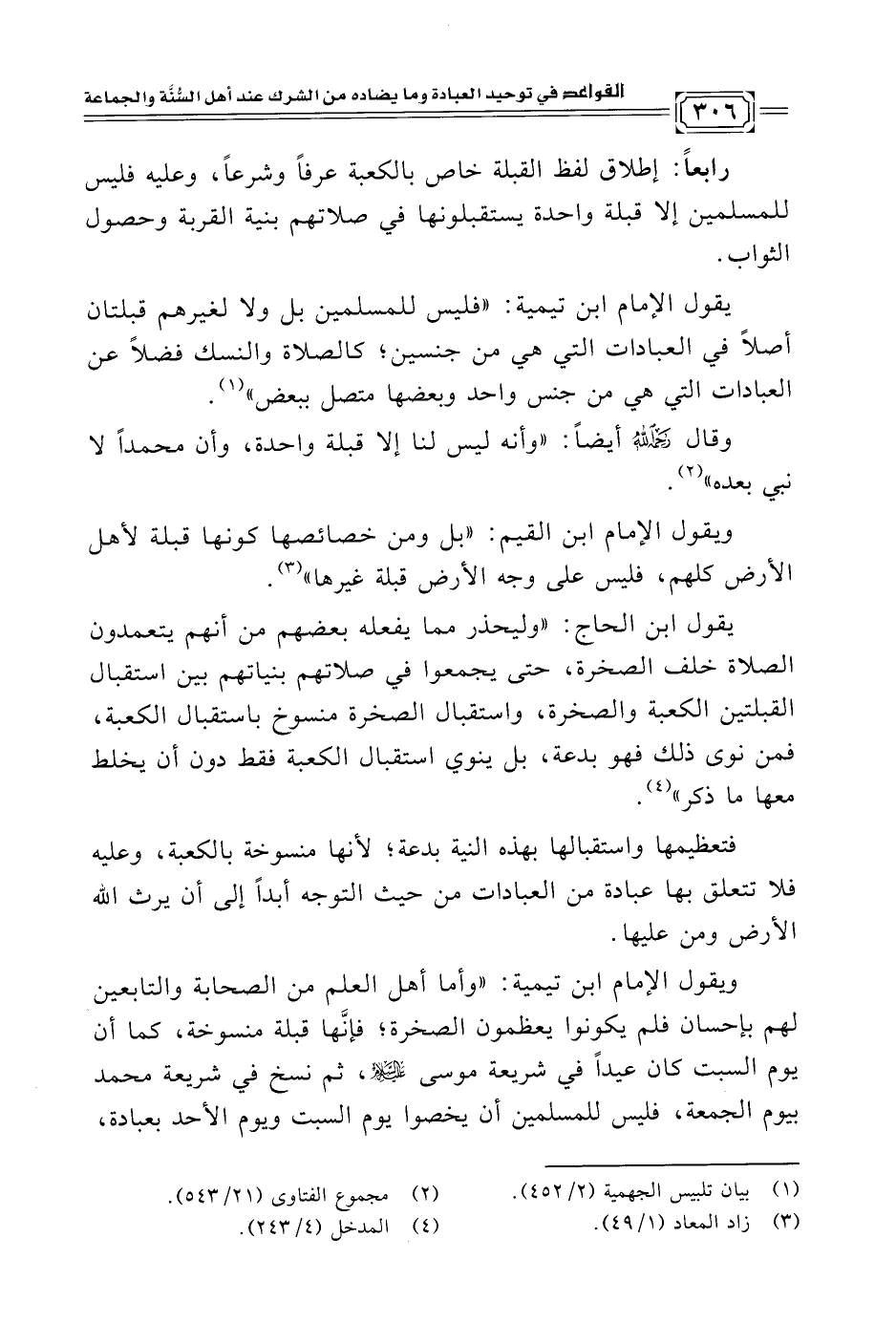 يقول الإمام ابن تيمية: "فليس للمسلمين بل ولا لغيرهم قبلتان أصلاً في العبادات التي هي من جنسين؛ كالصلاة والنسك فضلاً عن العبادات التي هي من جنس واحد وبعضها متصل ببعض" (¬١).