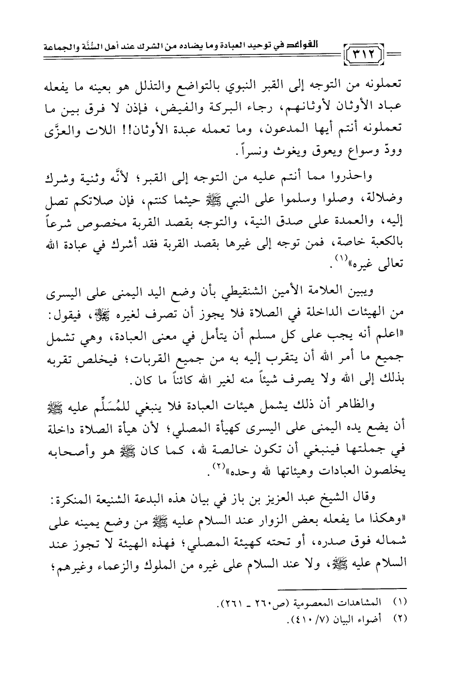 والظاهر أن ذلك يشمل هيئات العبادة فلا ينبغي للمُسَلِّم عليه -صلى الله عليه وسلم- أن يضع يده اليمنى على اليسرى كهيأة المصلي؛ لأن هيأة الصلاة داخلة في جملتها فينبغي أن تكون خالصة لله، كما كان -صلى الله عليه وسلم- هو وأصحابه يخلصون العبادات وهيئاتها لله وحده" (¬٢).