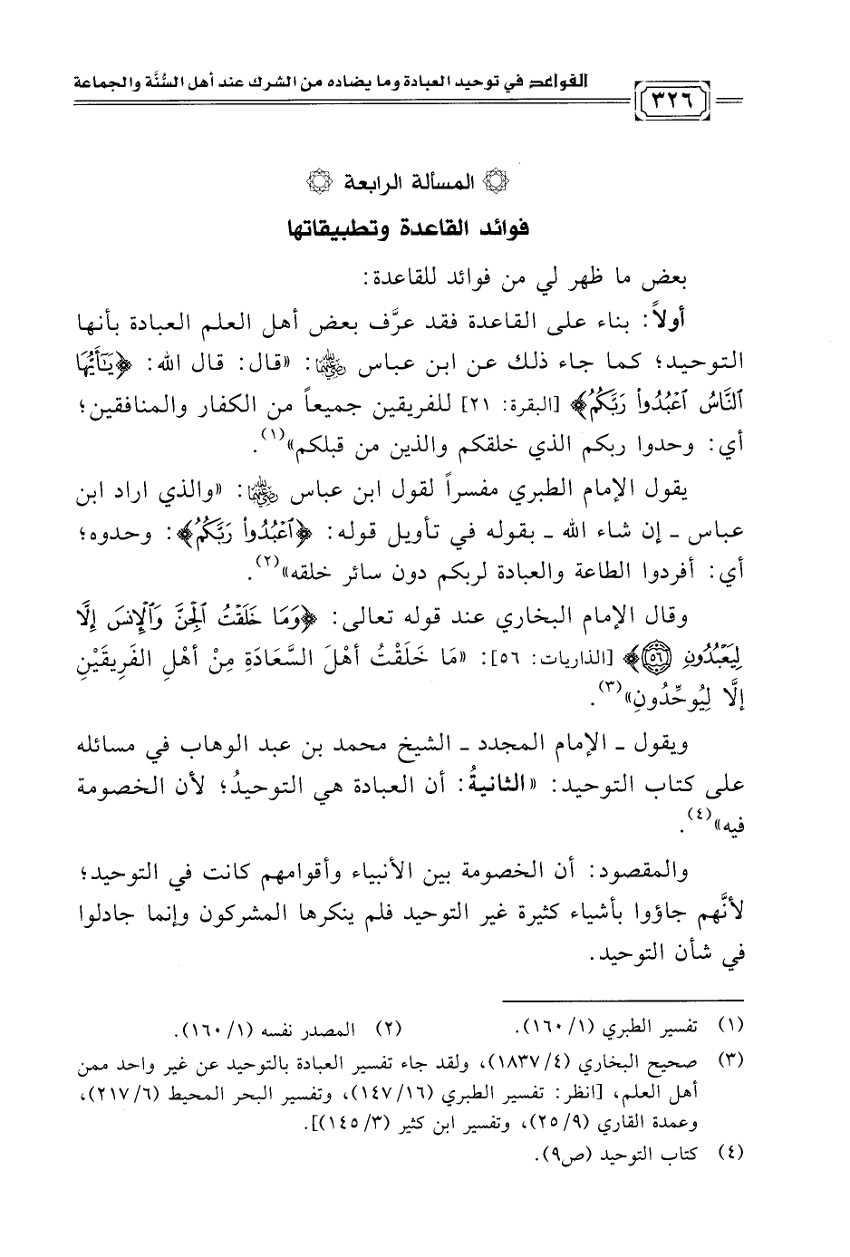 ويقول -الإمام المجدد- الشيخ محمد بن عبد الوهاب في مسائله على كتاب التوحيد: "الثانيةُ: أن العبادة هي التوحيدُ؛ لأن الخصومة فيه" (¬٤).