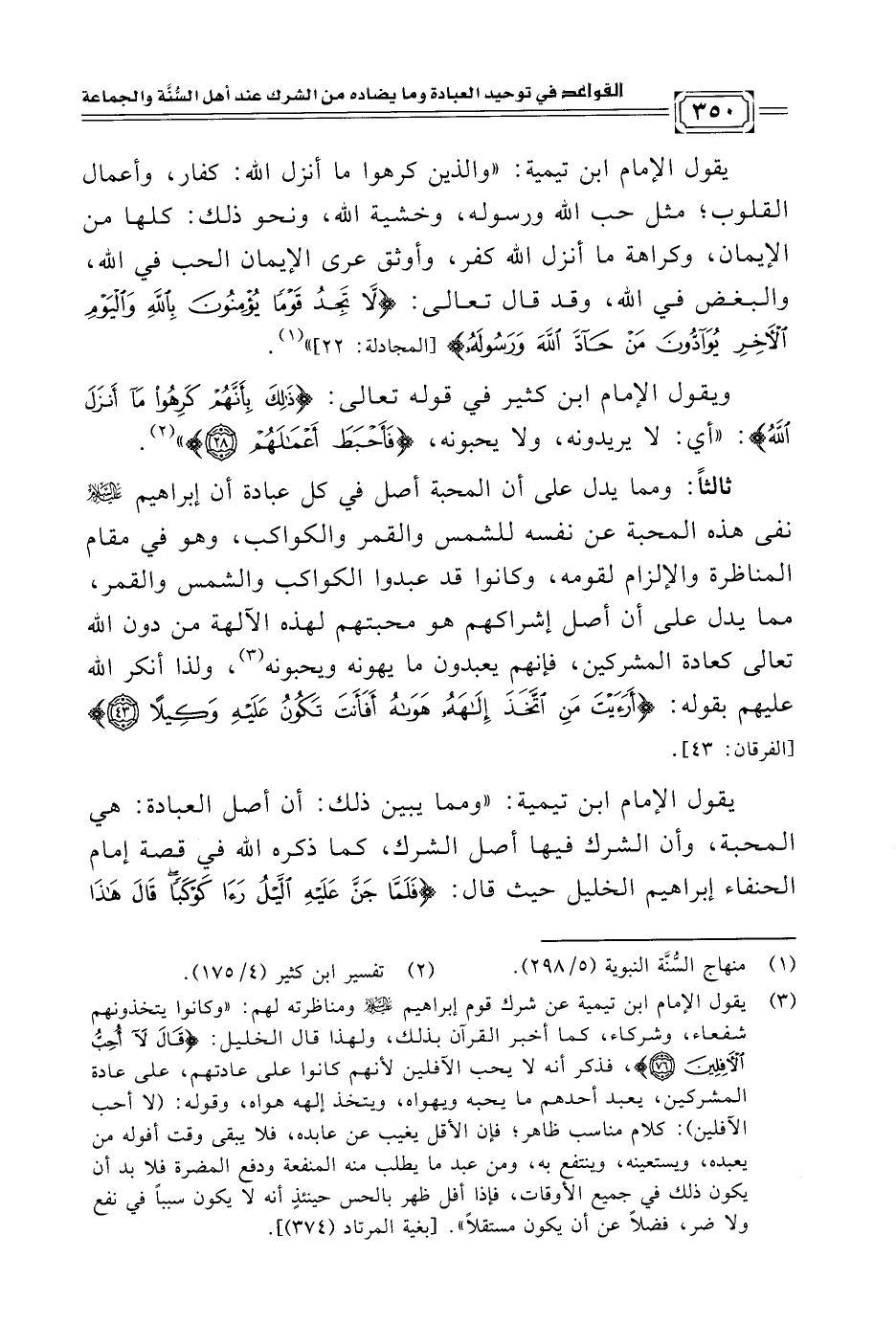 (¬٣) يقول الإمام ابن تيمية عن شرك قوم إبراهيم -عليه السلام- ومناظرته لهم: "وكانوا يتخذونهم شفعاء، وشركاء، كما أخبر القرآن بذلك، ولهذا قال الخليل: {قَالَ لَا أُحِبُّ الْآفِلِينَ (٧٦)}، فذكر أنه لا يحب الآفلين لأنهم كانوا على عادتهم، على عادة المشركين، يعبد أحدهم ما يحبه ويهواه، ويتخذ إلهه هواه، وقوله: (لا أحب الآفلين): كلام مناسب ظاهر؛ فإن الأقل يغيب عن عابده، فلا يبقى وقت أفوله من يعبده، ويستعينه، وينتفع به، ومن عبد ما يطلب منه المنفعة ودفع المضرة فلا بد أن يكون ذلك في جميع الأوقات، فإذا أفل ظهر بالحس حينئذٍ أنه لا يكون سببًا في نفع ولا ضر، فضلًا عن أن يكون مستقلًا". [بغية المرتاد (٣٧٤)].