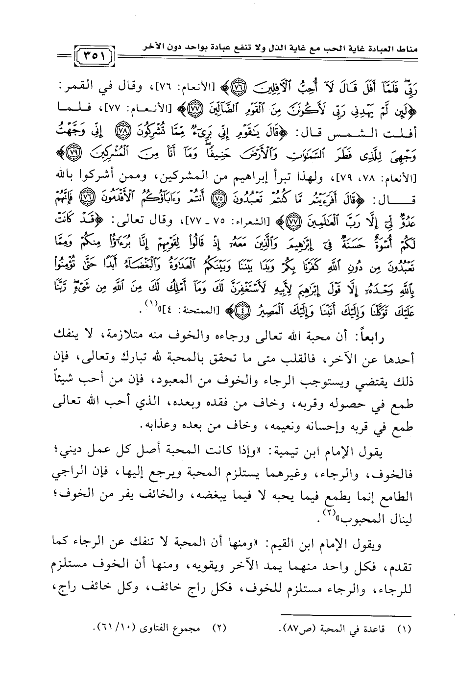 رَبِّي فَلَمَّا أَفَلَ قَالَ لَا أُحِبُّ الْآفِلِينَ (٧٦)} [الأنعام: ٧٦]، وقال في القمر: {لَئِنْ لَمْ يَهْدِنِي رَبِّي لَأَكُونَنَّ مِنَ الْقَوْمِ الضَّالِّينَ (٧٧)} [الأنعام: ٧٧]، فلما أفلت الشمس قال: {قَالَ يَاقَوْمِ إِنِّي بَرِيءٌ مِمَّا تُشْرِكُونَ (٧٨) إِنِّي وَجَّهْتُ وَجْهِيَ لِلَّذِي فَطَرَ السَّمَاوَاتِ وَالْأَرْضَ حَنِيفًا وَمَا أَنَا مِنَ الْمُشْرِكِينَ (٧٩)} [الأنعام: ٧٨، ٧٩]، ولهذا تبرأ إبراهيم من المشركين، وممن أشركوا بالله قال: {قَالَ أَفَرَأَيْتُمْ مَا كُنْتُمْ تَعْبُدُونَ (٧٥) أَنْتُمْ وَآبَاؤُكُمُ الْأَقْدَمُونَ (٧٦) فَإِنَّهُمْ عَدُوٌّ لِي إِلَّا رَبَّ الْعَالَمِينَ (٧٧)} [الشعراء: ٧٥ - ٧٧]، وقال تعالى: {قَدْ كَانَتْ لَكُمْ أُسْوَةٌ حَسَنَةٌ فِي إِبْرَاهِيمَ وَالَّذِينَ مَعَهُ إِذْ قَالُوا لِقَوْمِهِمْ إِنَّا بُرَآءُ مِنْكُمْ وَمِمَّا تَعْبُدُونَ مِنْ دُونِ اللَّهِ كَفَرْنَا بِكُمْ وَبَدَا بَيْنَنَا وَبَيْنَكُمُ الْعَدَاوَةُ وَالْبَغْضَاءُ أَبَدًا حَتَّى تُؤْمِنُوا بِاللَّهِ وَحْدَهُ إِلَّا قَوْلَ إِبْرَاهِيمَ لِأَبِيهِ لَأَسْتَغْفِرَنَّ لَكَ وَمَا أَمْلِكُ لَكَ مِنَ اللَّهِ مِنْ شَيْءٍ رَبَّنَا عَلَيْكَ تَوَكَّلْنَا وَإِلَيْكَ أَنَبْنَا وَإِلَيْكَ الْمَصِيرُ (٤)} [الممتحنة: ٤] " (¬١).