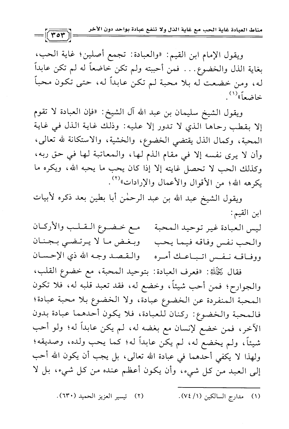 ويقول الإمام ابن القيم: "والعبادة: تجمع أصلين؛ غاية الحب، بغاية الذل والخضوع ... فمن أحببته ولم تكن خاضعًا له لم تكن عابدًا له، ومن خضعت له بلا محبة لم تكن عابدًا له، حتى تكون محبًا خاضعًا" (¬١).