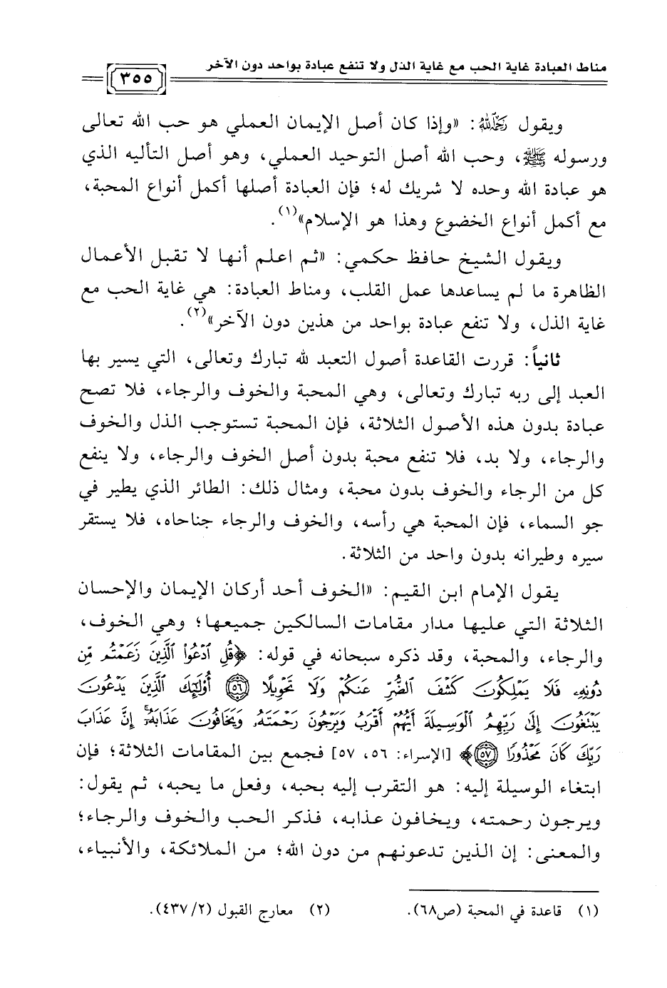 ويقول الشيخ حافظ حكمي: "ثم اعلم أنها لا تقبل الأعمال الظاهرة ما لم يساعدها عمل القلب، ومناط العبادة: هي غاية الحب مع غاية الذل، ولا تنفع عبادة بواحد من هذين دون الآخر" (¬٢).