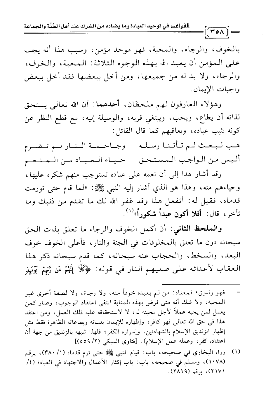 بالخوف، والرجاء، والمحبة، فهو موحد مؤمن، وسبب هذا أنه يجب على المؤمن أن يعبد الله بهذه الوجوه الثلاثة: المحبة، والخوف، والرجاء، ولا بد له من جميعها، ومن أخل ببعضها فقد أخل ببعض واجبات الإيمان.
