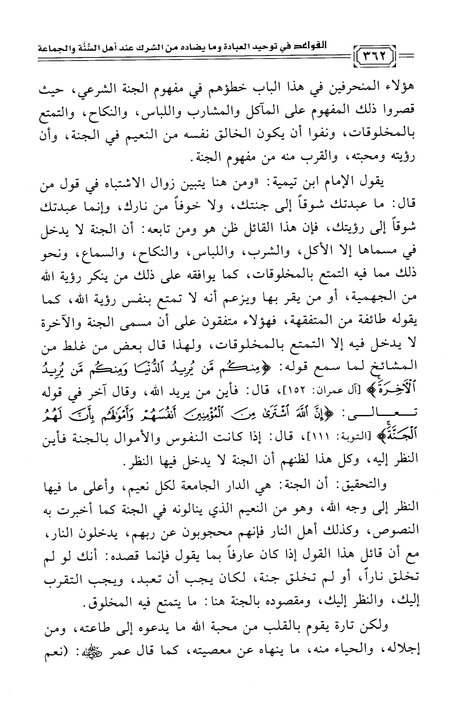 يقول الإمام ابن تيمية: "ومن هنا يتبين زوال الاشتباه في قول من قالى: ما عبدتك شوقًا إلى جنتك، ولا خوفًا من نارك، وإنما عبدتك شوقًا إلى رؤيتك، فإن هذا القائل ظن هو ومن تابعه: أن الجنة لا يدخل في مسماها إلا الأكل، والشرب، واللباس، والنكاح، والسماع، ونحو ذلك مما فيه التمتع بالمخلوقات، كما يوافقه على ذلك من ينكر رؤية الله من الجهمية، أو من يقر بها ويزعم أنه لا تمتع بنفس رؤية الله، كما يقوله طائفة من المتفقهة، فهؤلاء متفقون على أن مسمى الجنة والآخرة لا يدخل فيه إلا التمتع بالمخلوقات، ولهذا قال بعض من غلط من المشائِخ لما سمع قوله: {مِنْكُمْ مَنْ يُرِيدُ الدُّنْيَا وَمِنْكُمْ مَنْ يُرِيدُ الْآخِرَةَ} [آل عمران: ١٥٢]، قال: فأين من يريد الله، وقال آخر في قوله تعالى: {إِنَّ اللَّهَ اشْتَرَى مِنَ الْمُؤْمِنِينَ أَنْفُسَهُمْ وَأَمْوَالَهُمْ بِأَنَّ لَهُمُ الْجَنَّةَ} [التوبة: ١١١]، قال: إذا كانت النفوس والأموال بالجنة فأين النظر إليه، وكل هذا لظنهم أن الجنة لا يدخل فيها النظر.