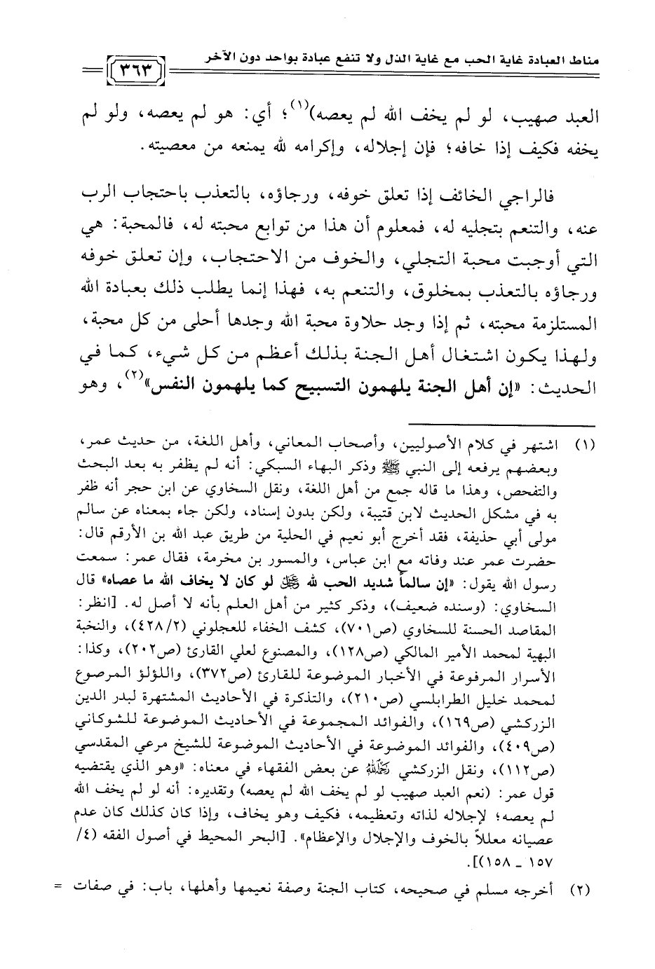 فالراجي الخائف إذا تعلق خوفه، ورجاؤه، بالتعذب باحتجاب الرب عنه، والتنعم بتجليه له، فمعلوم أن هذا من توابع محبته له، فالمحبة: هي التي أوجبت محبة التجلي، والخوف من الاحتجاب، وإن تعلق خوفه ورجاؤه بالتعذب بمخلوق، والتنعم به، فهذا إنما يطلب ذلك بعبادة الله المستلزمة محبته، ثم إذا وجد حلاوة محبة الله وجدها أحلى من كل محبة، ولهذا يكون اشتغال أهل الجنة بذلك أعظم من كل شيء، كما في الحديث: "إن أهل الجنة يلهمون التسبيح كما يلهمون النفس" (¬٢)، وهو