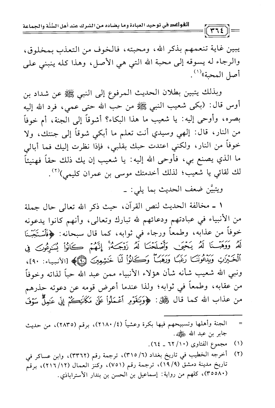 ١ - مخالفة الحديث لنص القرآن، حيث ذكر الله تعالى حال جملة من الأنبياء في عبادتهم ودعائهم لله تبارك وتعالى، وأنهم كانوا يدعونه خوفًا من عذابه، وطمعًا ورجاء في ثوابه، كما قال سبحانه: {فَاسْتَجَبْنَا لَهُ وَوَهَبْنَا لَهُ يَحْيَى وَأَصْلَحْنَا لَهُ زَوْجَهُ إِنَّهُمْ كَانُوا يُسَارِعُونَ فِي الْخَيْرَاتِ وَيَدْعُونَنَا رَغَبًا وَرَهَبًا وَكَانُوا لَنَا خَاشِعِينَ (٩٠)} [الأنبياء: ٩٠]، ونبي الله شعيب شأنه شأن هؤلاء الأنبياء ممن عبد الله حبًا لذاته وخوفًا من عقابه، وطمعًا في ثوابه؛ ولذا عندما أعرض قومه عن دعوته حذرهم من عذاب الله كما قال -عز وجل-: {وَيَاقَوْمِ اعْمَلُوا عَلَى مَكَانَتِكُمْ إِنِّي عَامِلٌ سَوْفَ