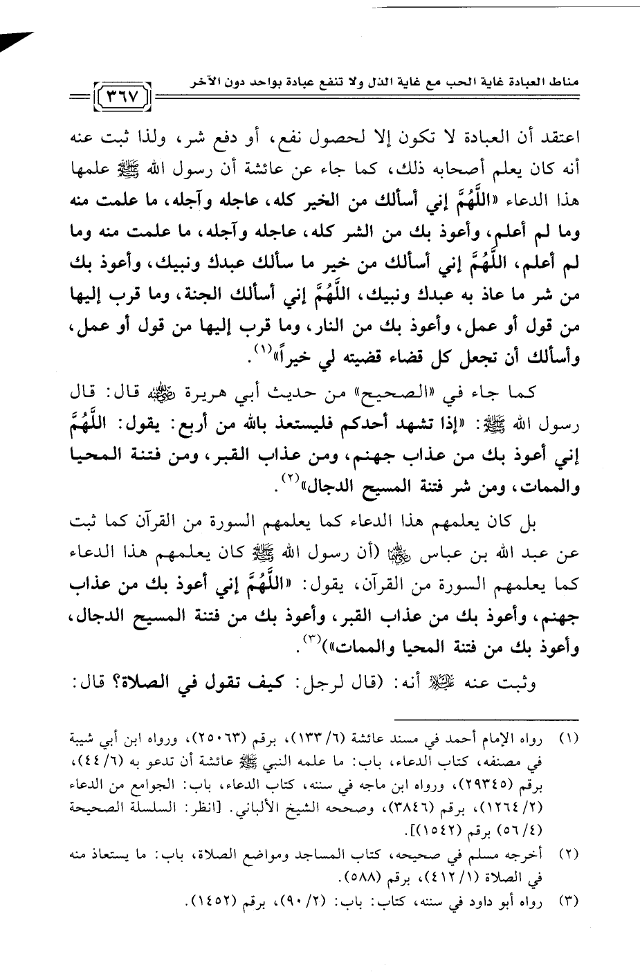 اعتقد أن العبادة لا تكون إلا لحصول نفع، أو دفع شر، ولذا ثبت عنه أنه كان يعلم أصحابه ذلك، كما جاء عن عائشة أن رسول الله -صلى الله عليه وسلم- علمها هذا الدعاء "اللَّهُمَّ إني أسألك من الخير كله، عاجله وآجله، ما علمت منه وما لم أعلم، وأعوذ بك من الشر كله، عاجله وآجله، ما علمت منه وما لم أعلم، اللَّهُمَّ إني أسألك من خير ما سألك عبدك ونبيك، وأعوذ بك من شر ما عاذ به عبدك ونبيك، اللَّهُمَّ إني أسألك الجنة، وما قرب إليها من قول أو عمل، وأعوذ بك من النار، وما قرب إليها من قول أو عمل، وأسألك أن تجعل كل قضاء قضيته لي خيرًا" (¬١).