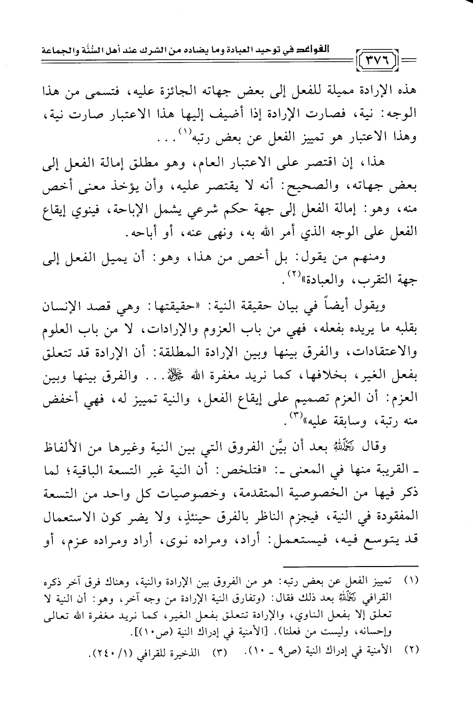 ويقول أيضًا في بيان حقيقة النية: "حقيقتها: وهى قصد الإنسان بقلبه ما يريده بفعله، فهي من باب العزوم والإرادات، لا من باب العلوم والاعتقادات، والفرق بينها وبين الإرادة المطلقة: أن الإرادة قد تتعلق بفعل الغير، بخلافها، كما نريد مغفرة الله جلا جلاله ... والفرق بينها وبين العزم: أن العزم تصميم على إيقاع الفعل، والنية تمييز له، فهي أخفض منه رتبة، وسابقة عليه" (¬٣).