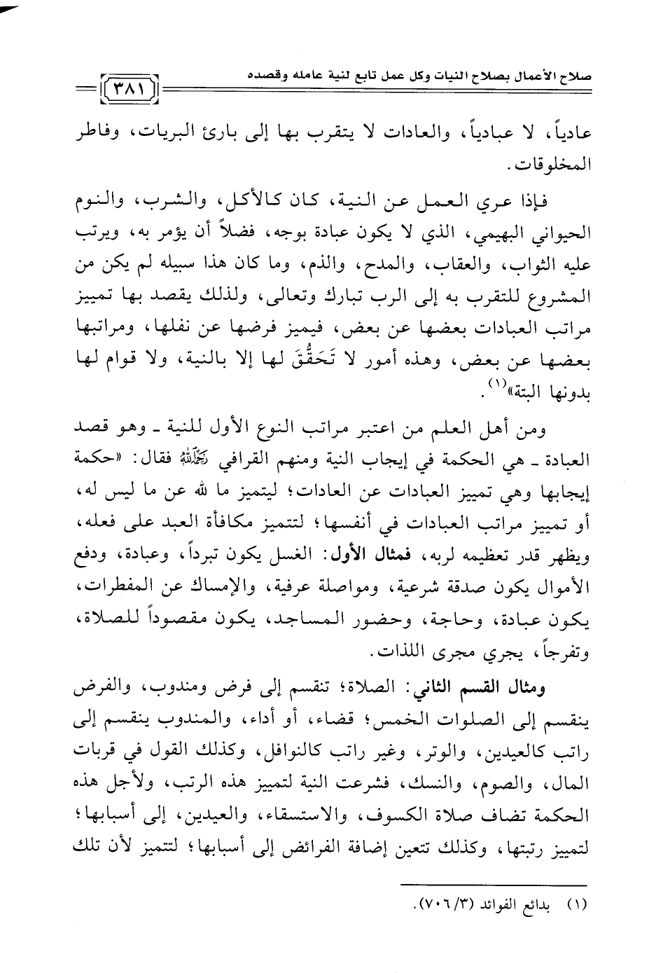 ومثال القسم الثاني: الصلاة؛ تنقسم إلى فرض ومندوب، والفرض ينقسم إلى الصلوات الخمس؛ قضاء، أو أداء، والمندوب ينقسم إلى راتب كالعيدين، والوتر، وغير راتب كالنوافل، وكذلك القول في قربات المال، والصوم، والنسك، فشرعت النية لتمييز هذه الرتب، ولأجل هذه الحكمة تضاف صلاة الكسوف، والاستسقاء، والعيدين، إلى أسبابها؛ لتمييز رتبتها، وكذلك تتعين إضافة الفرائض إلى أسبابها؛ لتتميز لأن تلك
