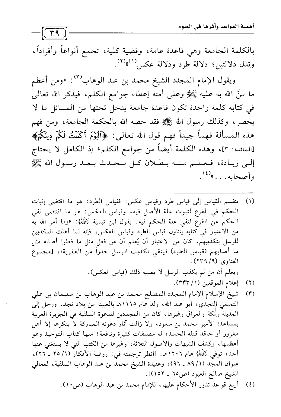 ويقول الإمام المجدد الشيخ محمد بن عبد الوهاب (¬٣): "ومن أعظم ما منَّ الله به عليه -صلى الله عليه وسلم- وعلى أمته إعطاء جوامع الكلم، فيذكر الله تعالى في كتابه كلمة واحدة تكون قاعدة جامعة يدخل تحتها من المسائل ما لا يحصر، وكذلك رسول الله -صلى الله عليه وسلم- فقد خصه الله بالحكمة الجامعة، ومن فهم هذه المسألة فهمًا جيدًا فهم قول الله تعالى: {الْيَوْمَ أَكْمَلْتُ لَكُمْ دِينَكُمْ} [المائدة: ٣]، وهذه الكلمة أيضًا من جوامع الكلم؛ إذ الكامل لا يحتاج إلى زيادة، فعلم منه بطلان كل محدث بعد رسول الله -صلى الله عليه وسلم- وأصحابه ... " (¬٤).
