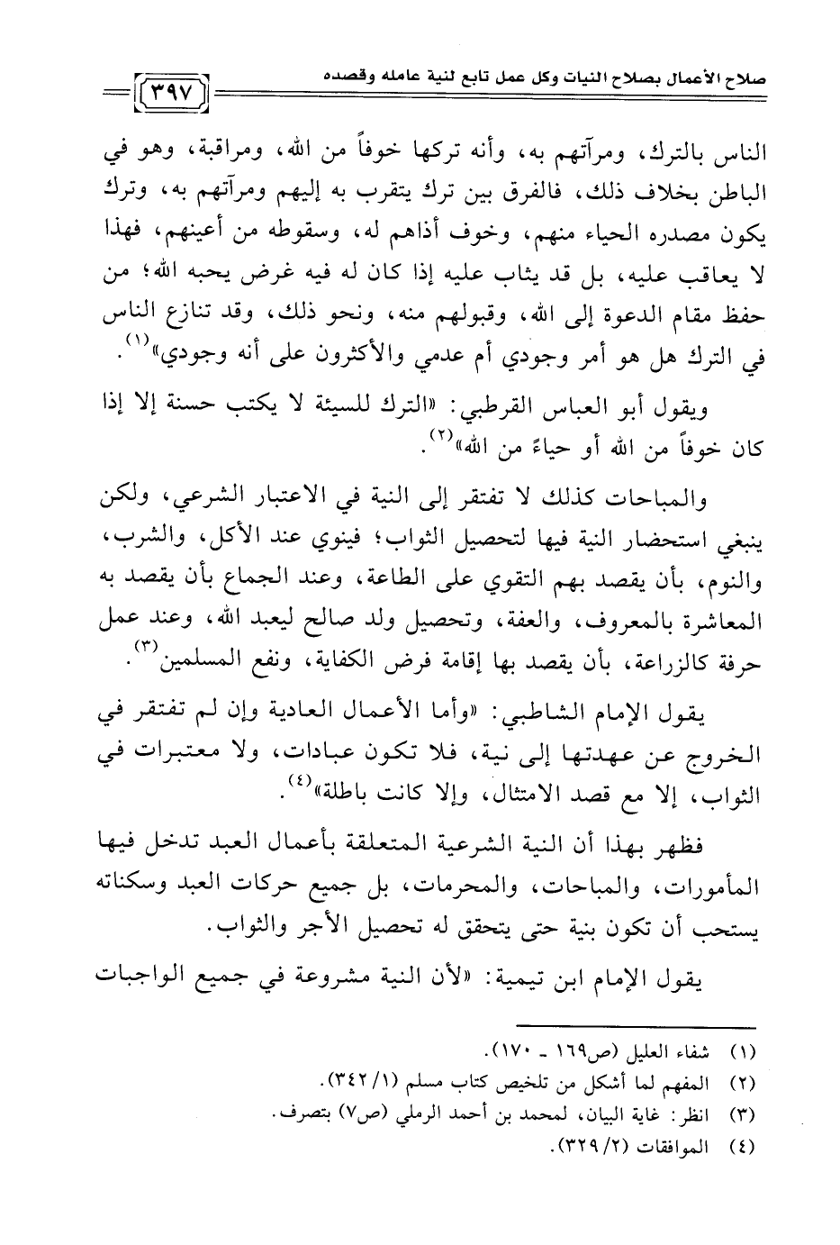 فظهر بهذا أن النية الشرعية المتعلقة بأعمال العبد تدخل فيها المأمورات، والمباحات، والمحرمات، بل جميع حركات العبد وسكناته يستحب أن تكون بنية حتى يتحقق له تحصيل الأجر والثواب.