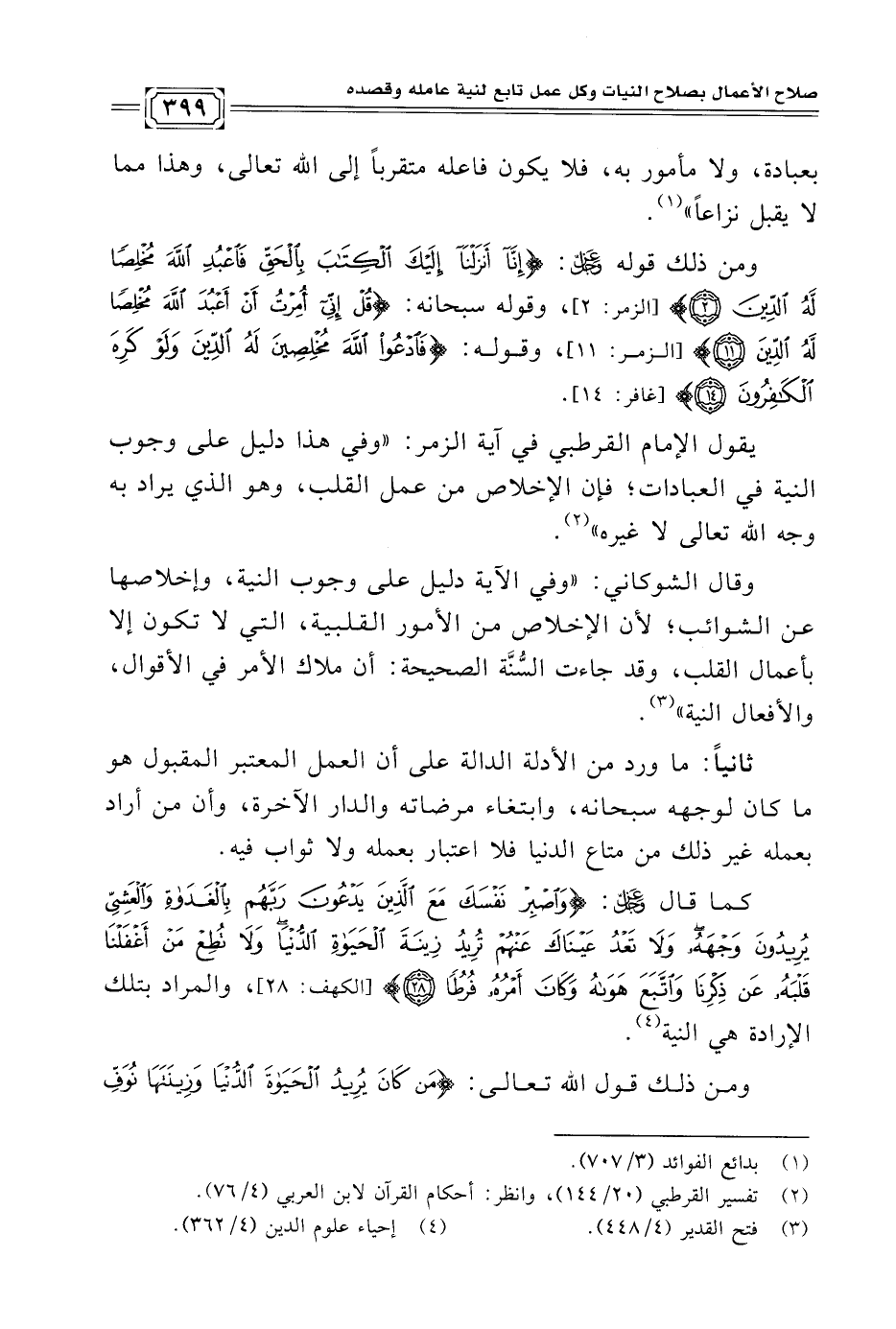 يقول الإمام القرطبي في آية الزمر: "وفي هذا دليل على وجوب النية في العبادات؛ فإن الإخلاص من عمل القلب، وهو الذي يراد به وجه الله تعالى لا غيره" (¬٢).