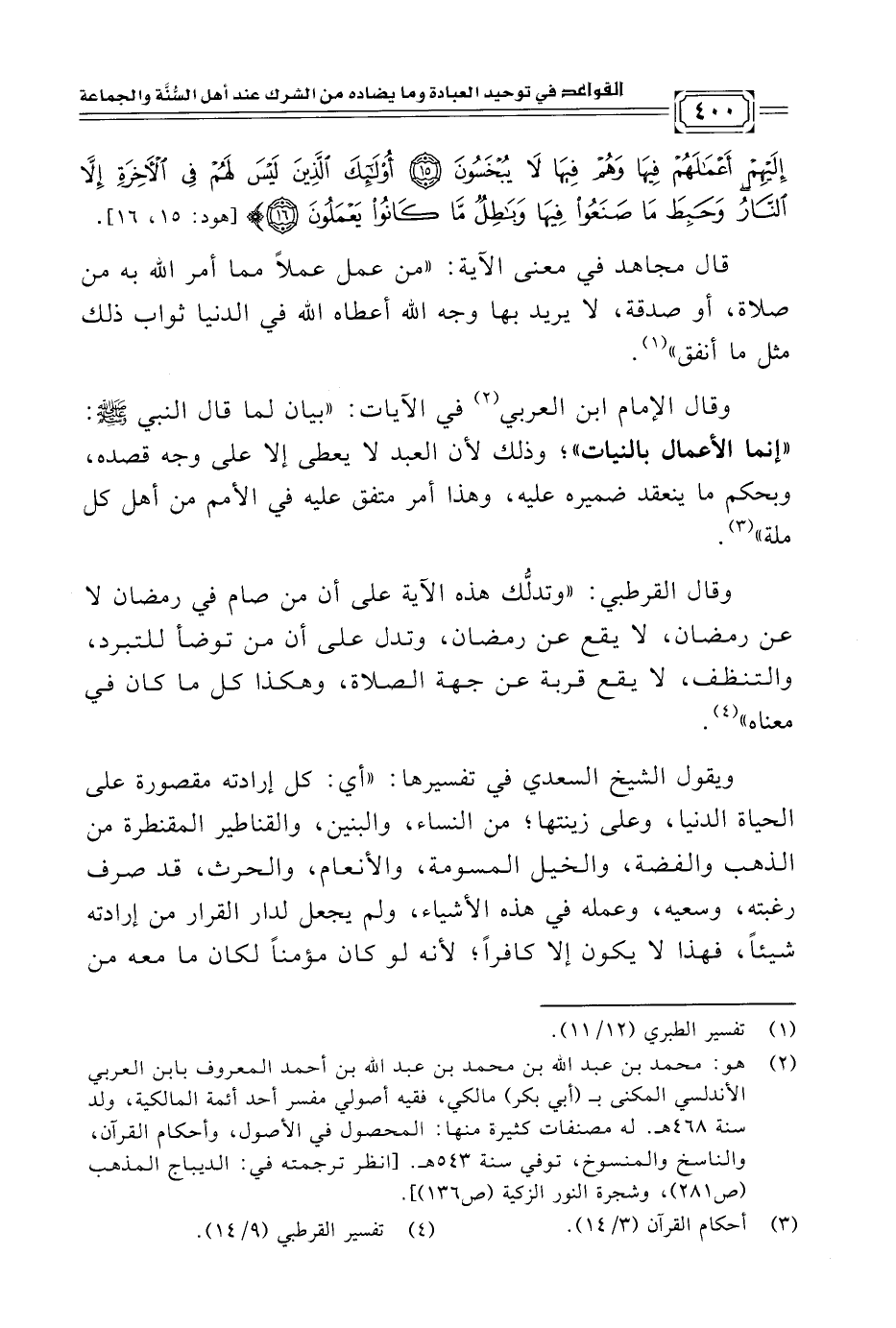 وقال الإمام ابن العربي (¬٢) في الآيات: "بيان لما قال النبي -صلى الله عليه وسلم-: "إنما الأعمال بالنيات"؛ وذلك لأن العبد لا يعطى إلا على وجه قصده، وبحكم ما ينعقد ضميره عليه، وهذا أمر متفق عليه في الأمم من أهل كل ملة" (¬٣).