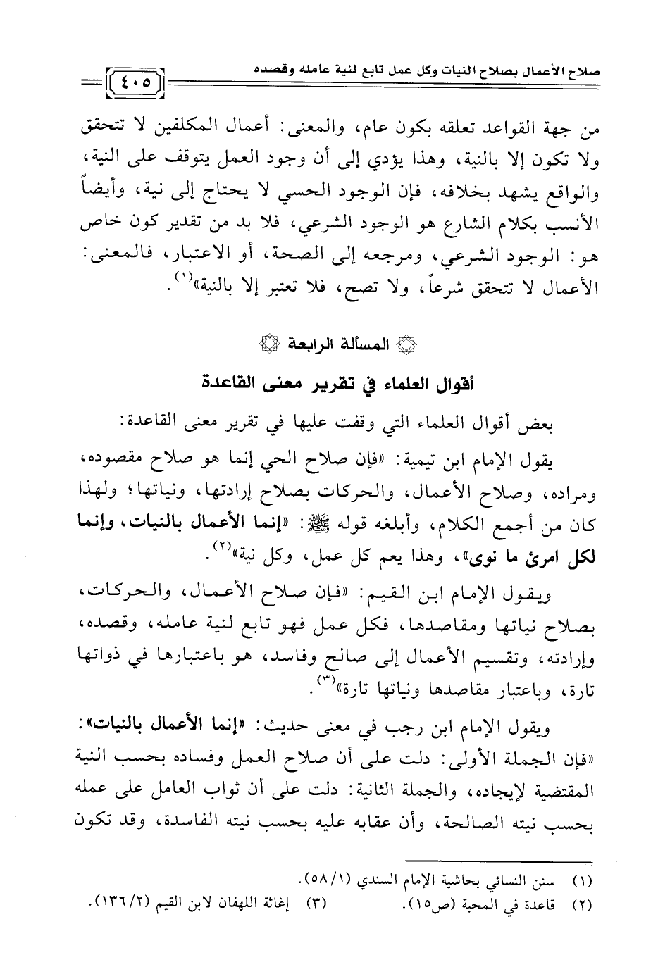 ويقول الإمام ابن القيم: "فإن صلاح الأعمال، والحركات، بصلاح نياتها ومقاصدها، فكل عمل فهو تابع لنية عامله، وقصده، وإرادته، وتقسيم الأعمال إلى صالح وفاسد، هو باعتبارها في ذواتها تارة، وباعتبار مقاصدها ونياتها تارة" (¬٣).