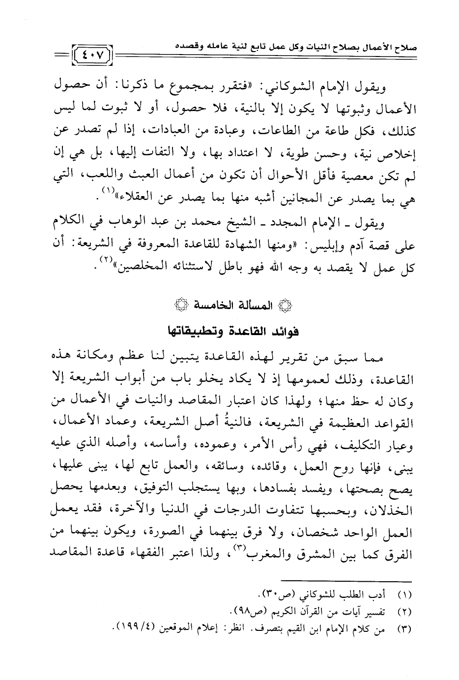 ويقول -الإمام المجدد- الشيخ محمد بن عبد الوهاب في الكلام على قصة آدم وإبليس: "ومنها الشهادة للقاعدة المعروفة في الشريعة: أن كل عمل لا يقصد به وجه الله فهو باطل لاستثنائه المخلصين" (¬٢).