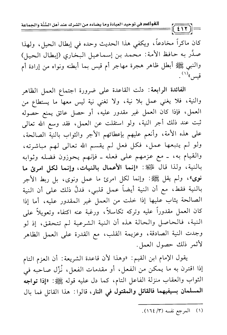 يقول الإمام ابن القيم: "وهذا لأن قاعدة الشريعة: أن العزم التام إذا اقترن به ما يمكن من الفعل، أو مقدمات الفعل، نُزِّل صاحبه في الثواب والعقاب منزلة الفاعل التام، كما دلى عليه قوله -صلى الله عليه وسلم-: "إذا تواجه المسلمان بسيفيهما فالقاتل والمقتول في النار، قالوا: هذا القاتل فما بال