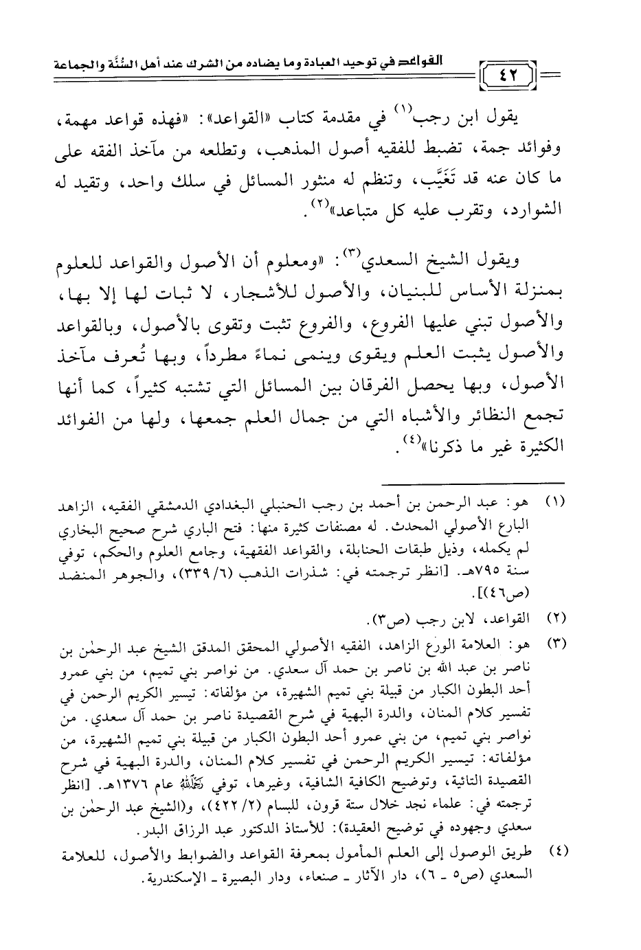 (¬٤) طريق الوصول إلى العلم المأمول بمعرفة القواعد والضوابط والأصول، للعلامة السعدي (ص ٥ - ٦)، دار الآثار - صنعاء، ودار البصرة - الإسكندرية.