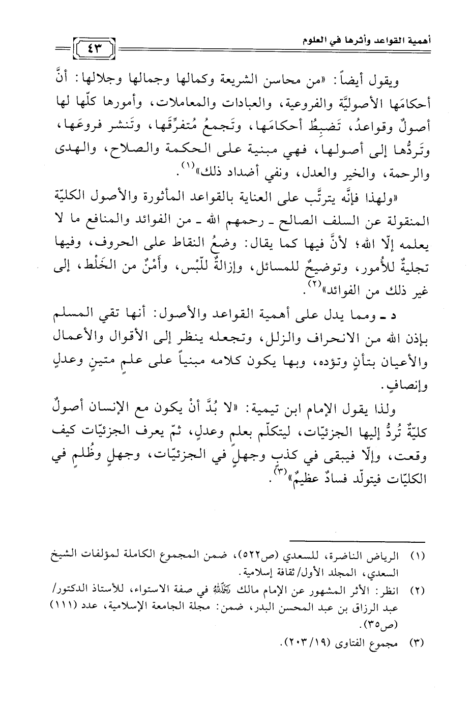 "ولهذا فإنَّه يترتَّب على العناية بالقواعد المأثورة والأصول الكليّة المنقولة عن السلف الصالح -رحمهم اللَّه- من الفوائد والمنافع ما لا يعلمه إلّا اللَّه؛ لأنَّ فيها كما يقال: وضعُ النقاط على الحروف، وفيها تجليةٌ للأُمور، وتوضيحٌ للمسائل، وإزالةٌ للّبْس، وأَمْنٌ من الخَلْط، إلى غير ذلك من الفوائد" (¬٢).