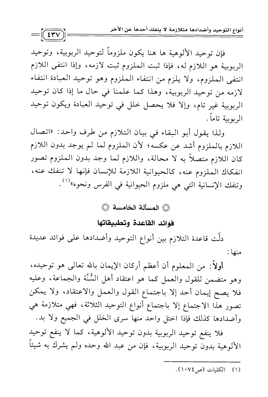 فإن توحيد الألوهية ها هنا يكون ملزومًا لتوحيد الربوبية، وتوحيد الربوبية هو اللازم له، فإذا ثبت الملزوم ثبت لازمه، وإذا انتفى اللازم انتفى الملزوم، ولا يلزم من انتفاء الملزوم وهو توحيد العبادة انتفاء لازمه من توحيد الربوبية، وهذا كما علمنا في حال ما إذا كان توحيد الربوبية غير تام، وإلا فلا يحصل خلل في توحيد العبادة ويكون توحيد الربوبية تامًا.
