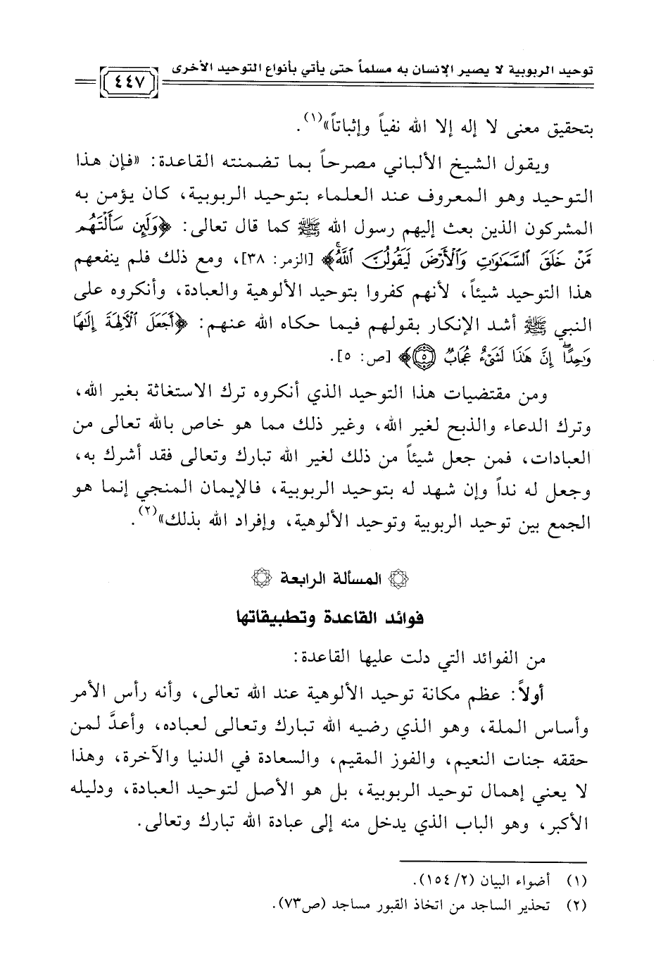 ويقول الشيخ الألباني مصرحًا بما تضمنته القاعدة: "فإن هذا التوحيد وهو المعروف عند العلماء بتوحيد الربوبية، كان يؤمن به المشركون الذين بعث إليهم رسول الله -صلى الله عليه وسلم- كما قال تعالى: {وَلَئِنْ سَأَلْتَهُمْ مَنْ خَلَقَ السَّمَاوَاتِ وَالْأَرْضَ لَيَقُولُنَّ اللَّهُ} [الزمر: ٣٨]، ومع ذلك فلم ينفعهم هذا التوحيد شيئًا، لأنهم كفروا بتوحيد الألوهية والعبادة، وأنكروه على النبي -صلى الله عليه وسلم- أشد الإنكار بقولهم فيما حكاه الله عنهم: {أَجَعَلَ الْآلِهَةَ إِلَهًا وَاحِدًا إِنَّ هَذَا لَشَيْءٌ عُجَابٌ (٥)} [ص: ٥].