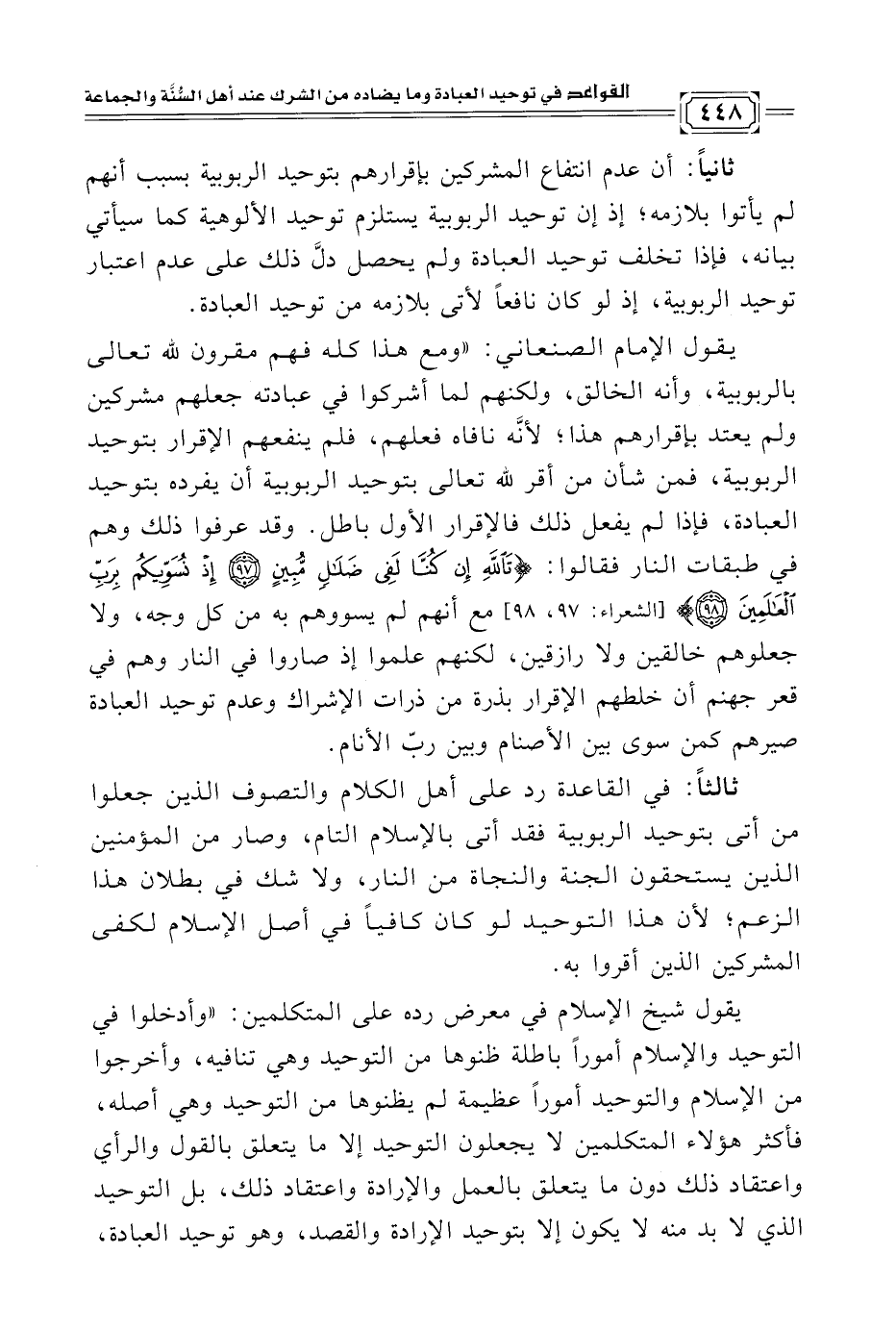 ثالثًا: في القاعدة رد على أهل الكلام والتصوف الذين جعلوا من أتى بتوحيد الربوبية فقد أتى بالإسلام التام، وصار من المؤمنين الذين يستحقون الجنة والنجاة من النار، ولا شك في بطلان هذا الزعم؛ لأن هذا التوحيد لو كان كافيًا في أصل الإسلام لكفى المشركين الذين أقروا به.