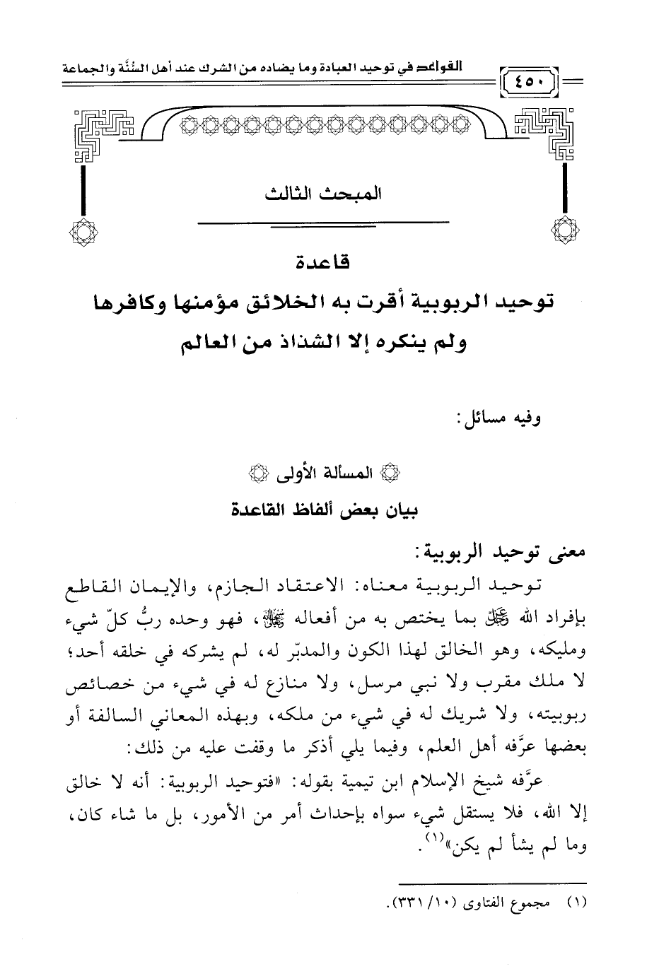 قاعدة توحيد الربوبية أقرت به الخلائق مؤمنها وكافرها ولم ينكره إلا الشذاذ من العالم
