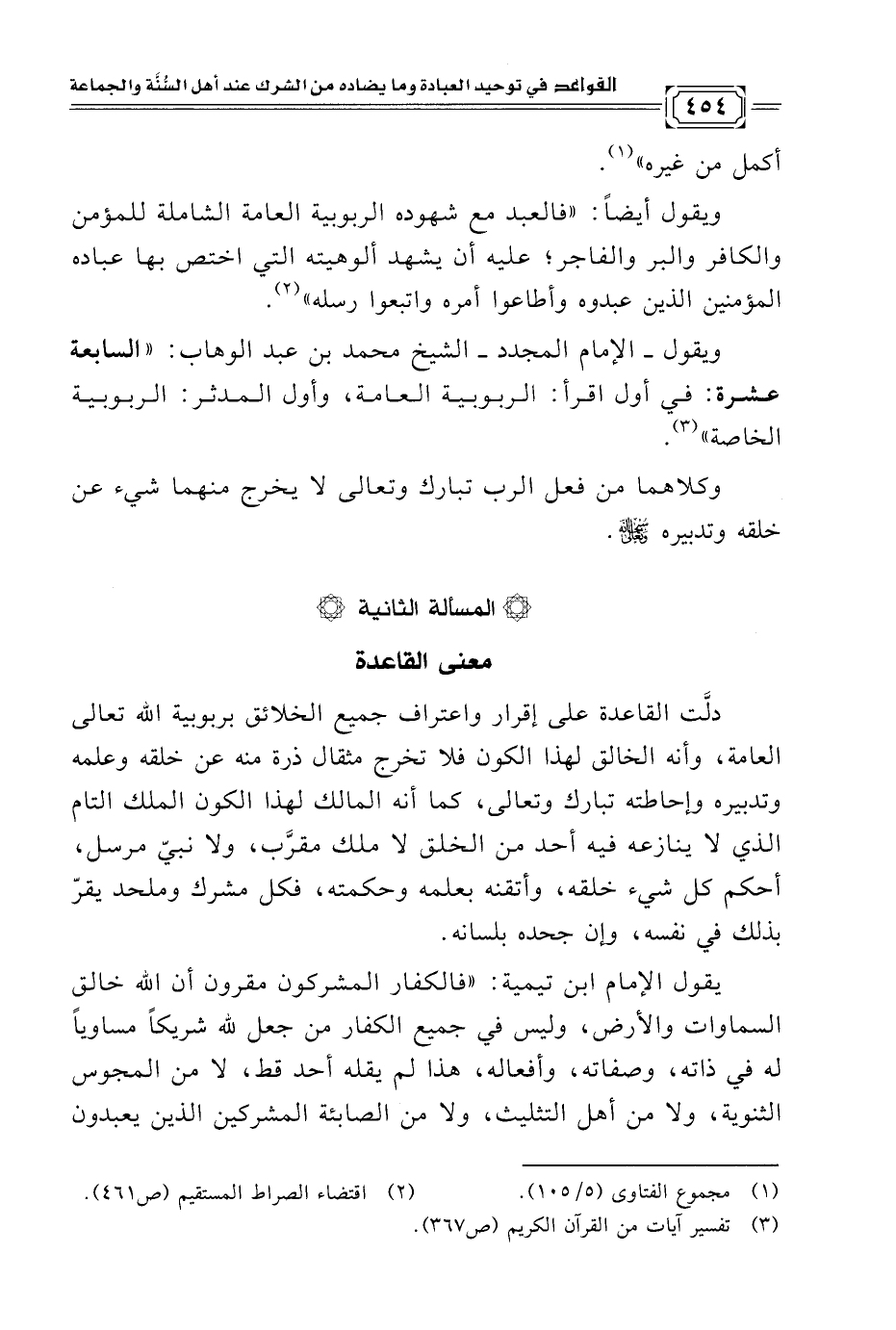 ويقول أيضًا: "فالعبد مع شهوده الربوبية العامة الشاملة للمؤمن والكافر والبر والفاجر؛ عليه أن يشهد ألوهيته التي اختص بها عباده المؤمنين الذين عبدوه وأطاعوا أمره واتبعوا رسله" (¬٢).