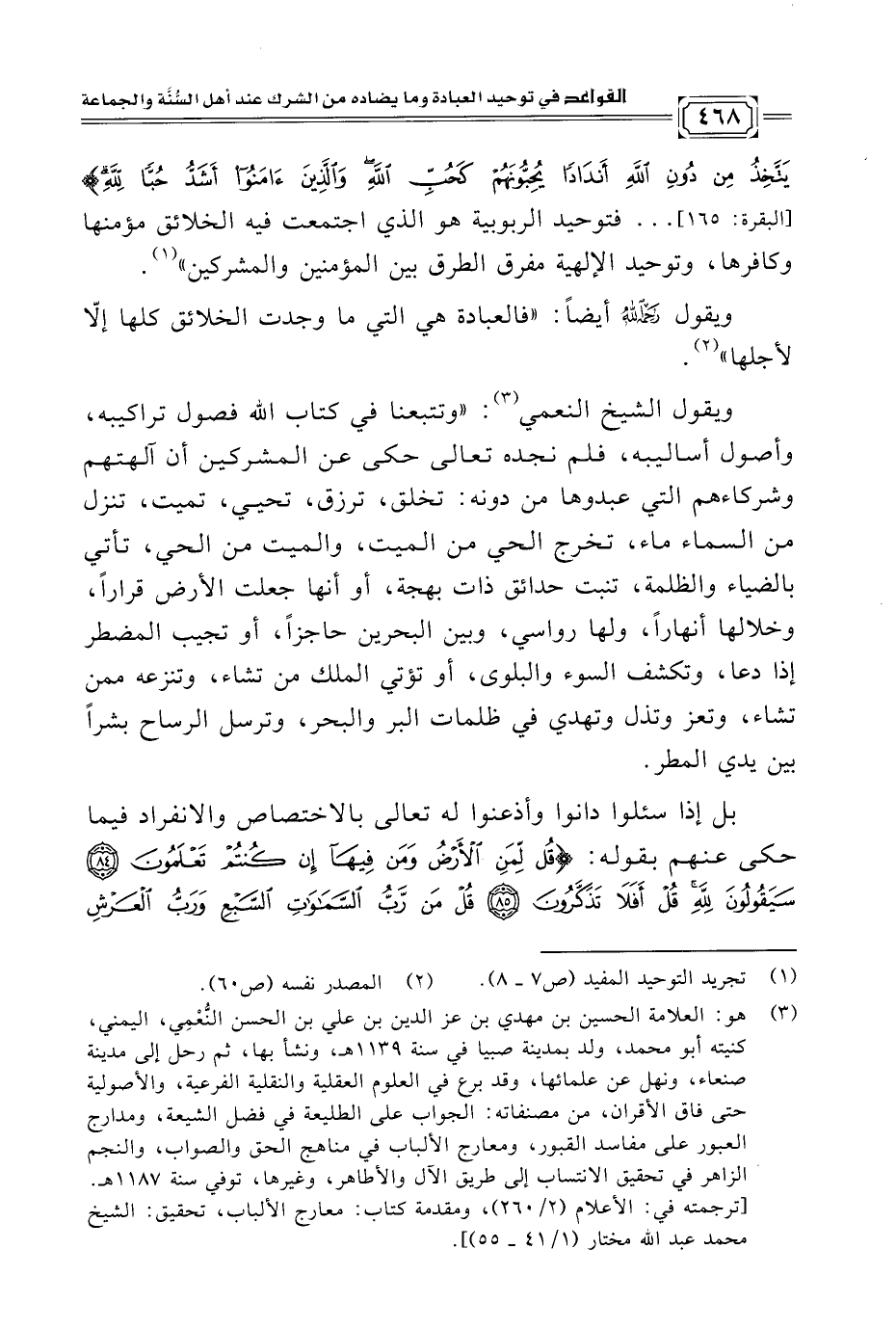ويقول الشيخ النعمي (¬٣): "وتتبعنا في كتاب الله فصول تراكيبه، وأصول أساليبه، فلم نجده تعالى حكى عن المشركين أن آلهتهم وشركاءهم التي عبدوها من دونه: تخلق، ترزق، تحيي، تميت، تنزل من السماء ماء، تخرج الحي من الميت، والميت من الحي، تأتي بالضياء والظلمة، تنبت حدائق ذات بهجة، أو أنها جعلت الأرض قرارًا، وخلالها أنهارًا، ولها رواسي، وبين البحرين حاجزًا، أو تجيب المضطر إذا دعا، وتكشف السوء والبلوى، أو تؤتي الملك من تشاء، وتنزعه ممن تشاء، وتعز وتذل وتهدي في ظلمات البر والبحر، وترسل الرياح بشرًا بين يدي المطر.