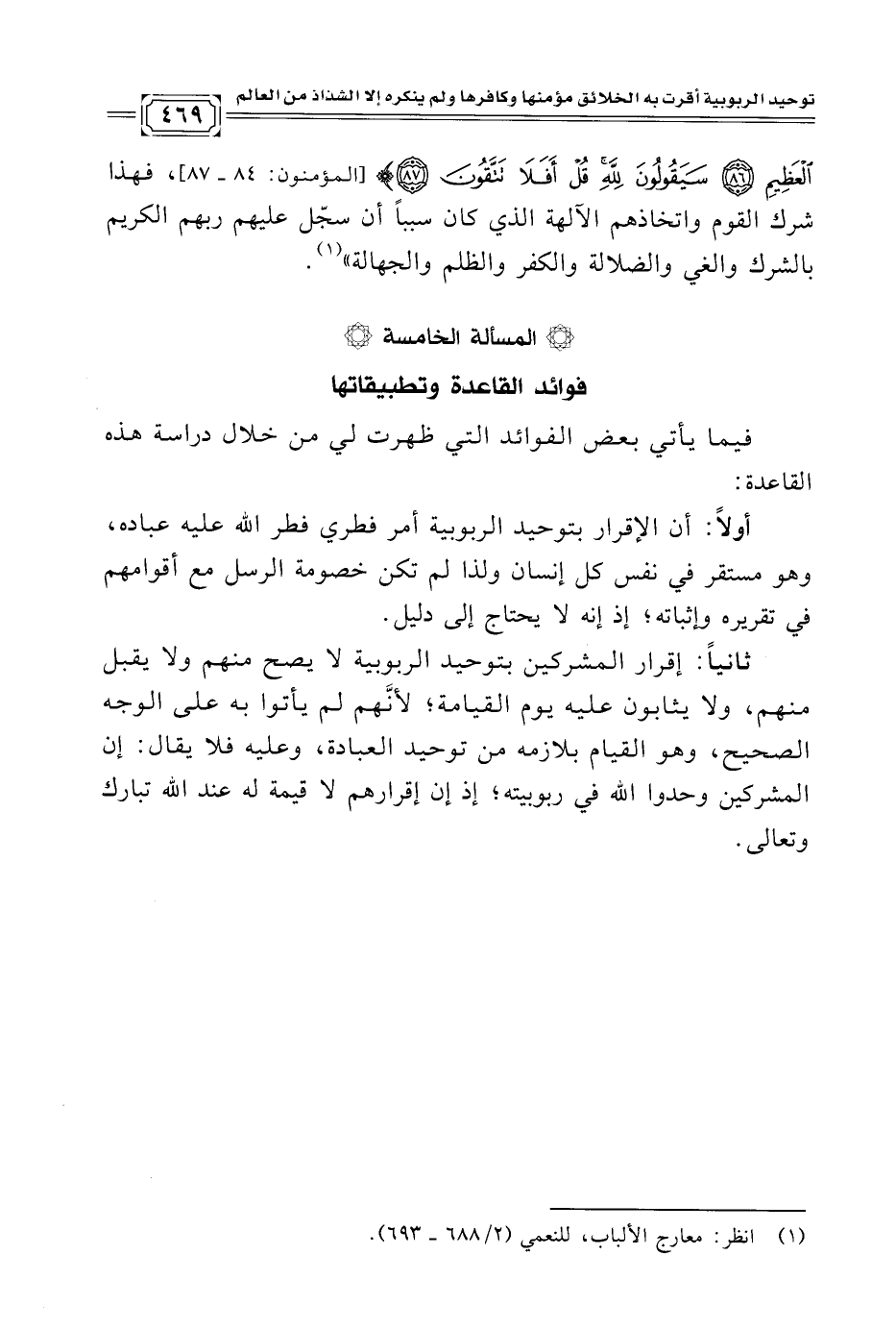 * المسألة الخامسة* فوائد القاعدة وتطبيقاتها