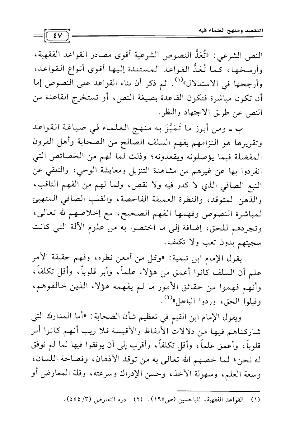 ب - ومن أبرز ما تَمَيَّزَ به منهج العلماء في صياغة القواعد وتقريرها هو التزامهم بفهم السلف الصالح من الصحابة وأهل القرون المفضلة فيما يؤصلونه ويقعدونه؛ وذلك لما لهم من الخصائص التي انفردوا بها عن غيرهم من مشاهدة التنزيل ومعايشة الوحي، والتلقي عن النبع الصافي الذي لا كدر فيه ولا نقص، ولما لهم من الفهم الثاقب، والذهن المتوقد، والنظرة العميقة الفاحصة، والقلب الصافي المتهيئ لمباشرة النصوص وفهمها الفهم الصحيح، مع إخلاصهم للّه تعالى، وتجردهم للحق، إضافة إلى ما اختصوا به من علوم الآلة التي كانت سجيتهم بدون تعب ولا تكلف.