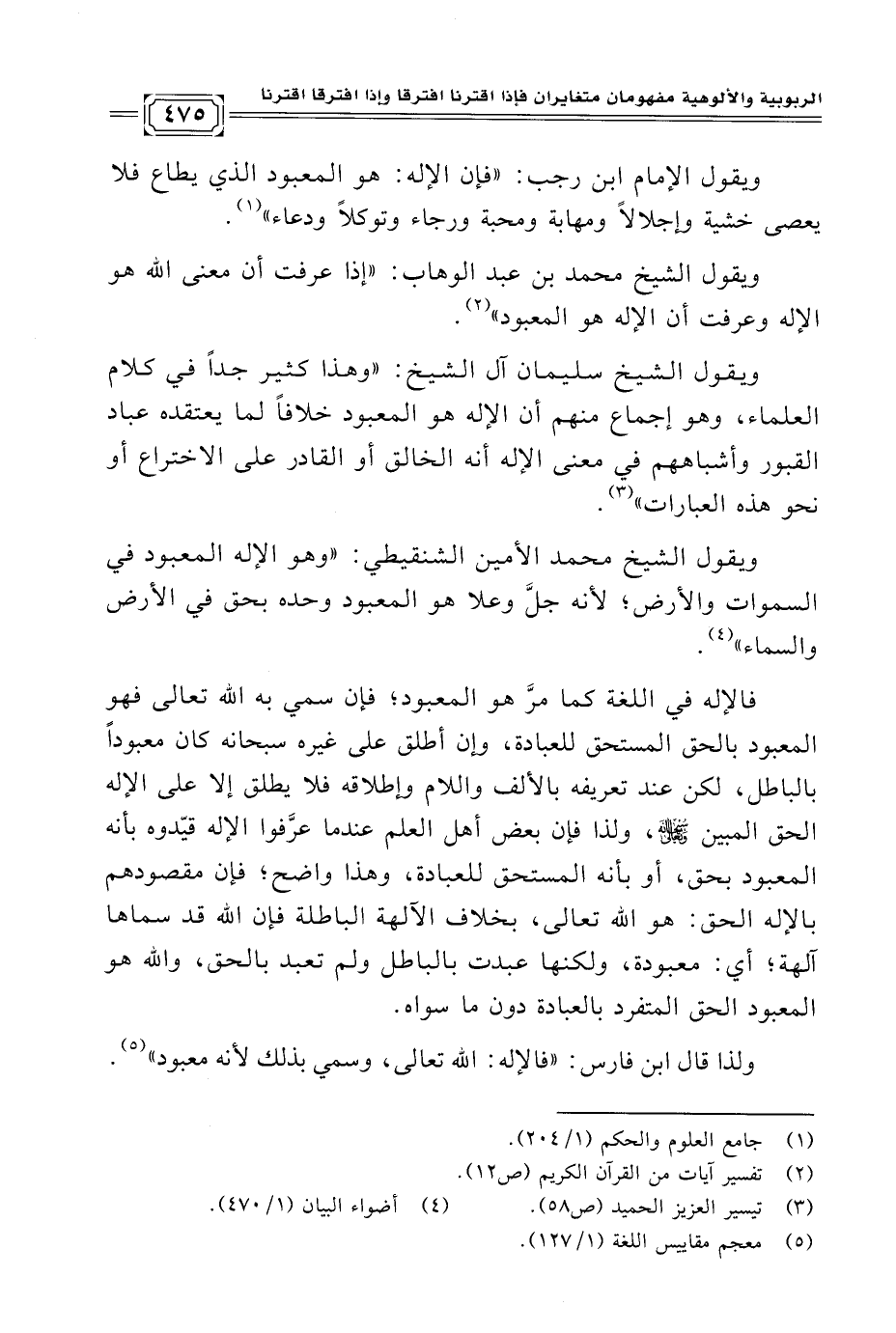ويقول الإمام ابن رجب: "فإن الإله: هو المعبود الذي يطاع فلا يعصى خشية وإجلالًا ومهابة ومحبة ورجاء وتوكلًا ودعاء" (¬١).
