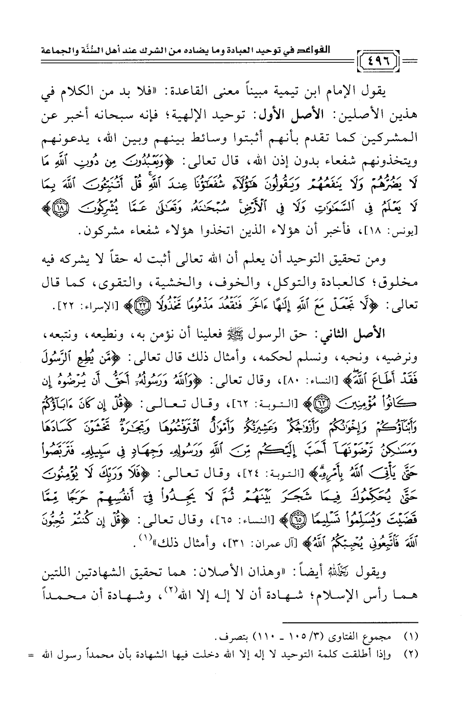 ويقول رَحمه الله أيضًا: "وهذان الأصلان: هما تحقيق الشهادتين اللتين هما رأس الإسلام؛ شهادة أن لا إله إلا الله (¬٢)، وشهادة أن محمدًا