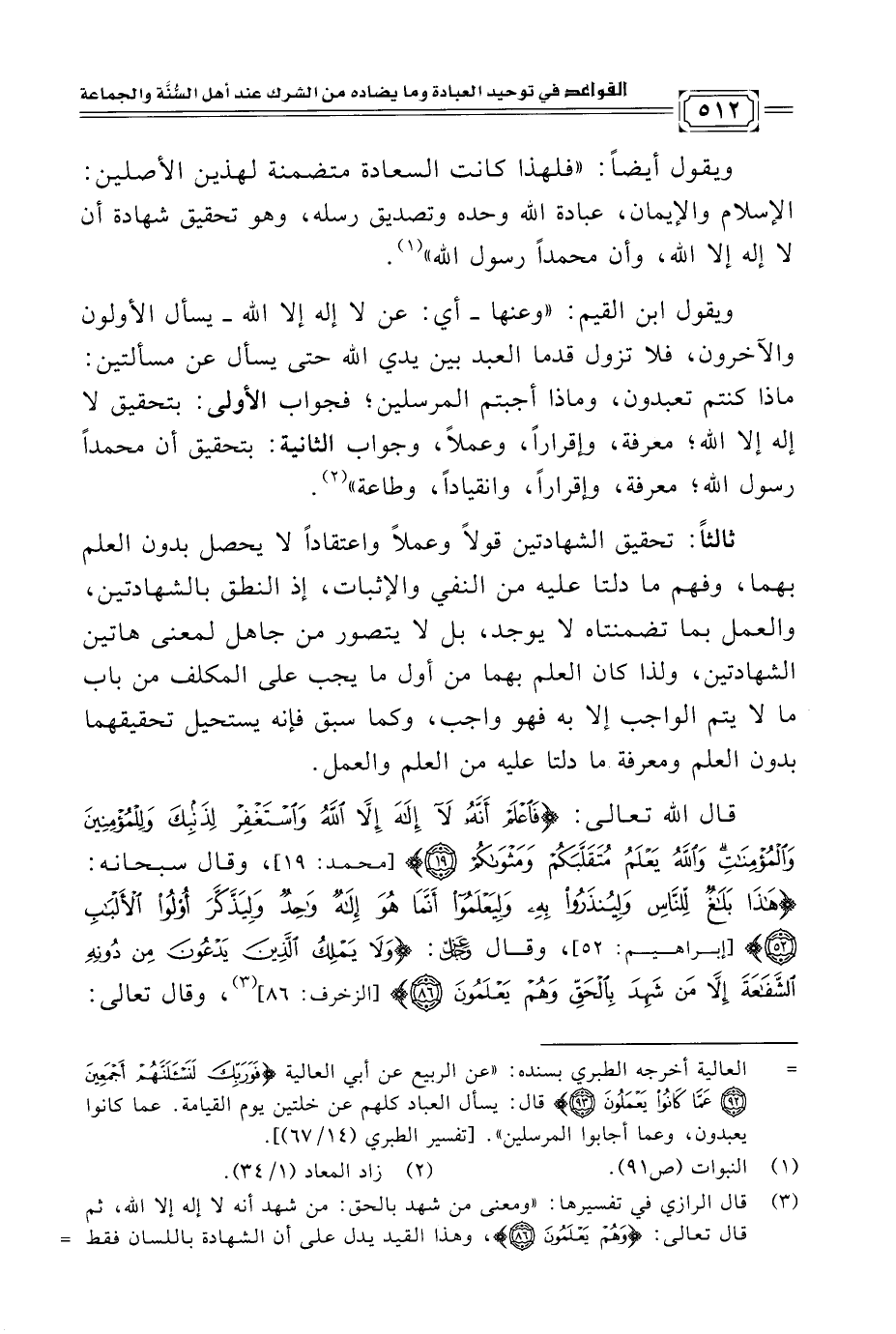 قال اللّه تعالى: {فَاعْلَمْ أَنَّهُ لَا إِلَهَ إِلَّا اللَّهُ وَاسْتَغْفِرْ لِذَنْبِكَ وَلِلْمُؤْمِنِينَ وَالْمُؤْمِنَاتِ وَاللَّهُ يَعْلَمُ مُتَقَلَّبَكُمْ وَمَثْوَاكُمْ (١٩)} [محمد: ١٩]، وقال سبحانه: {هَذَا بَلَاغٌ لِلنَّاسِ وَلِيُنْذَرُوا بِهِ وَلِيَعْلَمُوا أَنَّمَا هُوَ إِلَهٌ وَاحِدٌ وَلِيَذَّكَّرَ أُولُو الْأَلْبَابِ (٥٢} [إبراهيم: ٥٢]، وقال عز وجل: {وَلَا يَمْلِكُ الَّذِينَ يَدْعُونَ مِنْ دُونِهِ الشَّفَاعَةَ إِلَّا مَنْ شَهِدَ بِالْحَقِّ وَهُمْ يَعْلَمُونَ (٨٦)} [الزخرف: ٨٦] (¬٣)، وقال تعالى: