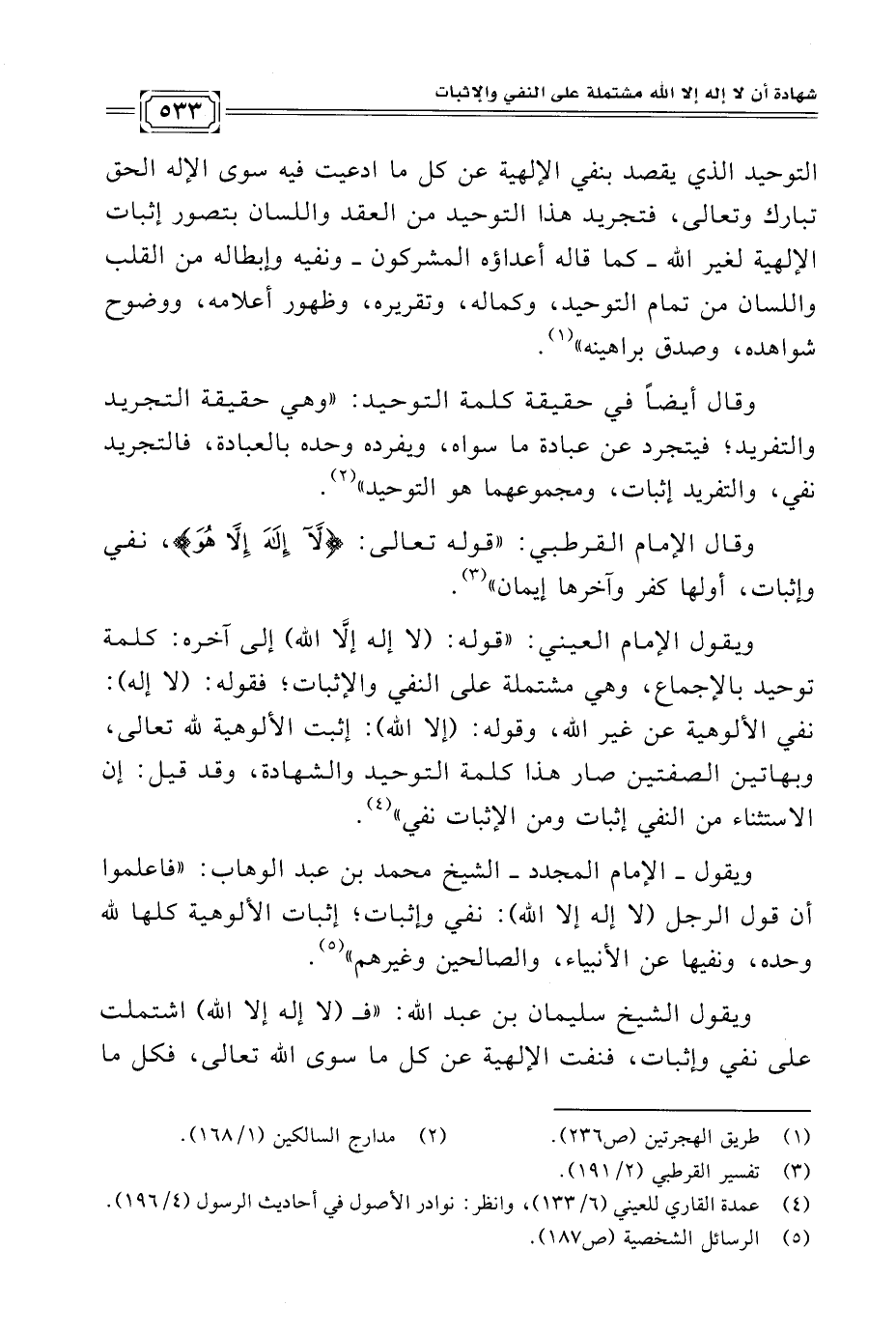 التوحيد الذي يقصد بنفي الإلهية عن كل ما ادعيت فيه سوى الإله الحق تبارك وتعالى، فتجريد هذا التوحيد من العقد واللسان بتصور إثبات الإلهية لغير اللّه -كما قاله أعداؤه المشركون- ونفيه وإبطاله من القلب واللسان من تمام التوحيد، وكماله، وتقريره، وظهور أعلامه، ووضوح شواهده، وصدق براهينه" (¬١).