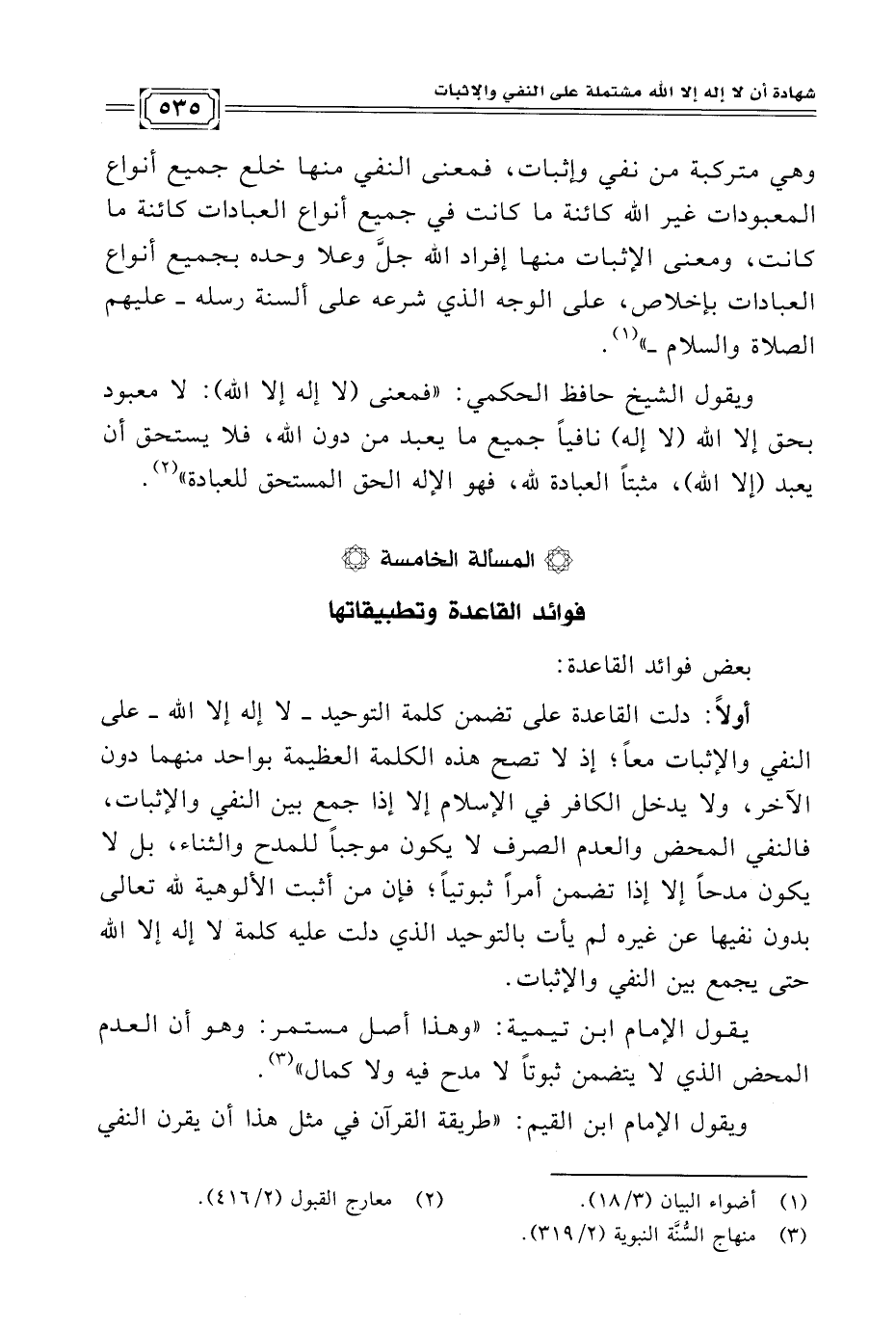 أولًا: دلت القاعدة على تضمن كلمة التوحيد -لا إله إلا اللّه- على النفي والإثبات معًا؛ إذ لا تصح هذه الكلمة العظيمة بواحد منهما دون الآخر، ولا يدخل الكافر في الإسلام إلا إذا جمع بين النفي والإثبات، فالنفي المحض والعدم الصرف لا يكون موجبًا للمدح والثناء، بل لا يكون مدحًا إلا إذا تضمن أمرًا ثبوتيًا؛ فإن من أثبت الألوهية لله تعالى بدون نفيها عن غيره لم يأت بالتوحيد الذي دلت عليه كلمة لا إله إلا اللّه حتى يجمع بين النفي والإثبات.