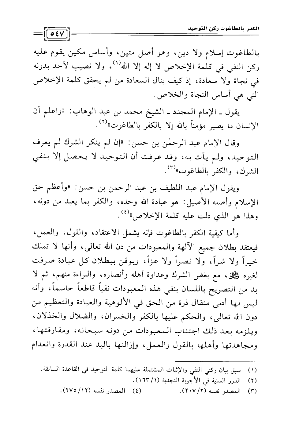 يقول -الإمام المجدد- الشيخ محمد بن عبد الوهاب: "واعلم أن الإنسان ما يصير مؤمنًا بالله إلا بالكفر بالطاغوت" (¬٢).