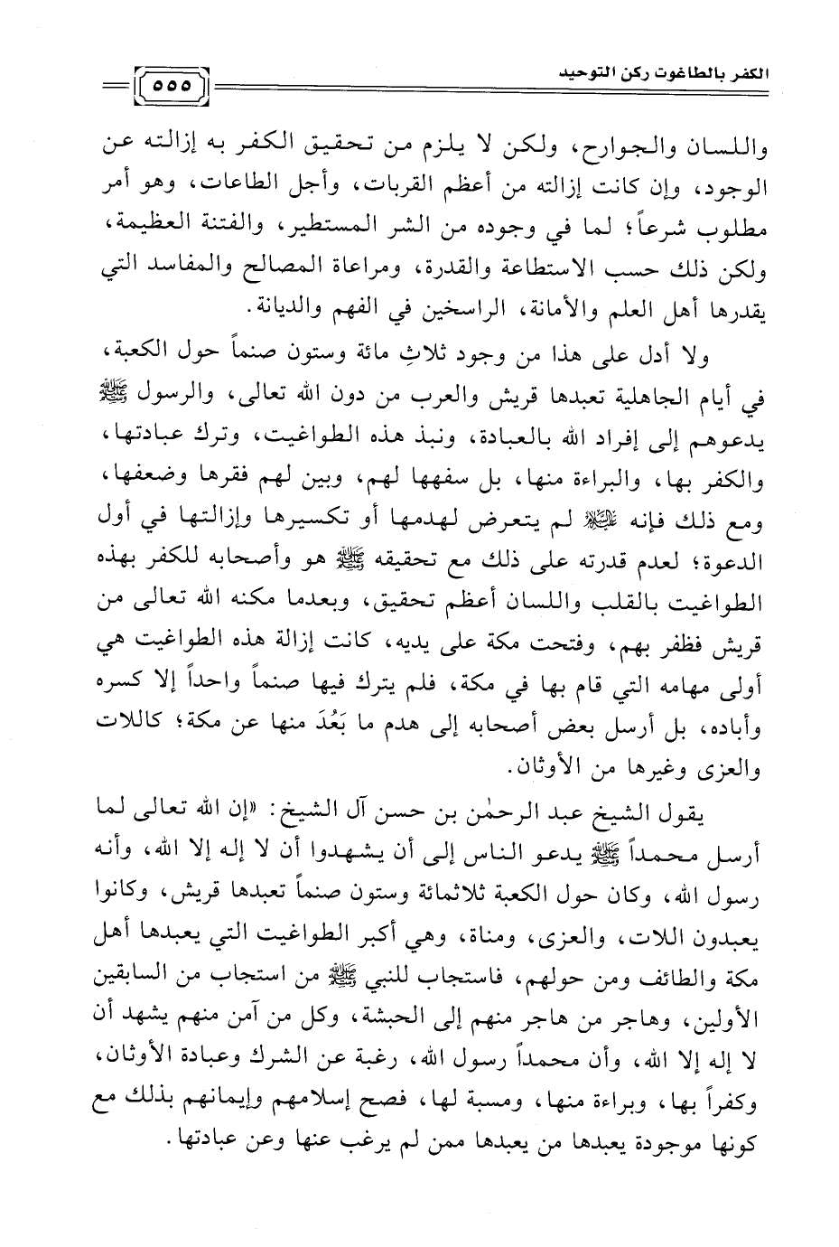 يقول الشيخ عبد الرحمن بن حسن آل الشيخ: "إن الله تعالى لما أرسل محمدًا -صلى الله عليه وسلم- يدعو الناس إلى أن يشهدوا أن لا إله إلا الله، وأنه رسول الله، وكان حول الكعبة ثلاثمائة وستون صنمًا تعبدها قريش، وكانوا يعبدون اللات، والعزى، ومناة، وهي أكبر الطواغيت التي يعبدها أهل مكة والطائف ومن حولهم، فاستجاب للنبي -صلى الله عليه وسلم- من استجاب من السابقين الأولين، وهاجر من هاجر منهم إلى الحبشة، وكل من آمن منهم يشهد أن لا إله إلا الله، وأن محمدًا رسول الله، رغبة عن الشرك وعبادة الأوثان، وكفرًا بها، وبراءة منها، ومسبة لها، فصح إسلامهم وإيمانهم بذلك مع كونها موجودة يعبدها من يعبدها ممن لم يرغب عنها وعن عبادتها.
