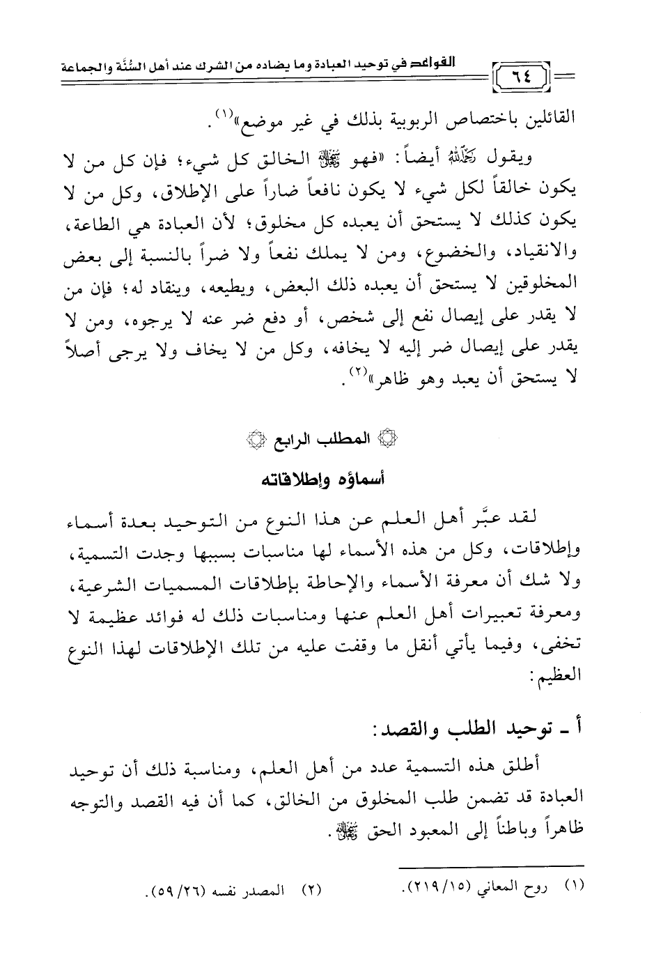 ويقول -رَحِمَهُ اللّه- أيضًا: "فهو -سُبْحَانَهُ وَتَعَالَى- الخالق كل شيء؛ فإن كل من لا يكون خالقًا لكل شيء لا يكون نافعًا ضارًا على الإطلاق، وكل من لا يكون كذلك لا يستحق أن يعبده كل مخلوق؛ لأن العبادة هي الطاعة، والانقياد، والخضوع، ومن لا يملك نفعًا ولا ضرًا بالنسبة إلى بعض المخلوقين لا يستحق أن يعبده ذلك البعض، ويطيعه، وينقاد له، فإن من لا يقدر على إيصال نفع إلى شخص، أو دفع ضر عنه لا يرجوه، ومن لا يقدر على إيصال ضر إليه لا يخافه، وكل من لا يخاف ولا يرجى أصلًا لا يستحق أن يعبد وهو ظاهر" (¬٢).