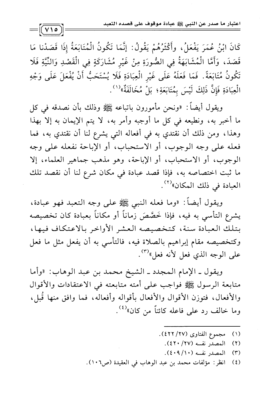 ويقول أيضًا: "ونحن مأمورون باتباعه -صلى الله عليه وسلم- وذلك بأن نصدقه في كل ما أخبر به، ونطيعه في كل ما أوجبه وأمر به، لا يتم الإيمان به إلا بهذا وهذا، ومن ذلك أن نقتدي به في أفعاله التي يشرع لنا أن نقتدي به، فما فعله على وجه الوجوب، أو الاستحباب، أو الإباحة نفعله على وجه الوجوب، أو الاستحباب، أو الإباحة، وهو مذهب جماهير العلماء، إلا ما ثبت اختصاصه به، فإذا قصد عبادة في مكان شرع لنا أن نقصد تلك العبادة في ذلك المكان" (¬٢).