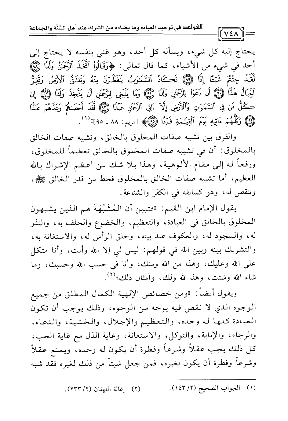 يقول الإمام ابن القيم: "فتبين أن المُشَبِّهَةَ هم الذين يشبهون المخلوق بالخالق في العبادة، والتعظيم، والخضوع والحلف به، والنذر له، والسجود له، والعكوف عند بيته، وحلق الرأس له، والاستغاثة به، والتشريك بينه وبين الله في قولهم: ليس لي إلا الله وأنت، وأنا متكل على الله وعليك، وهذا من الله ومنك، وأنا في حسب الله وحسبك، وما شاء الله وشئت، وهذا لله ولك، وأمثال ذلك" (¬٢).