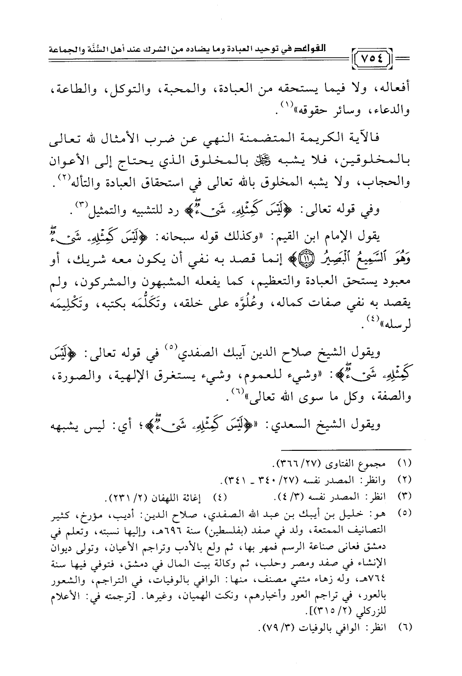ويقول الشيخ صلاح الدين آيبك الصفدي (¬٥) في قوله تعالى: {لَيْسَ كَمِثْلِهِ شَيْءٌ}: "وشيء للعموم، وشيء يستغرق الإلهية، والصورة، والصفة، وكل ما سوى الله تعالى" (¬٦).